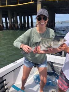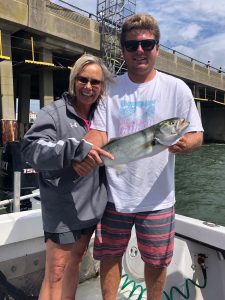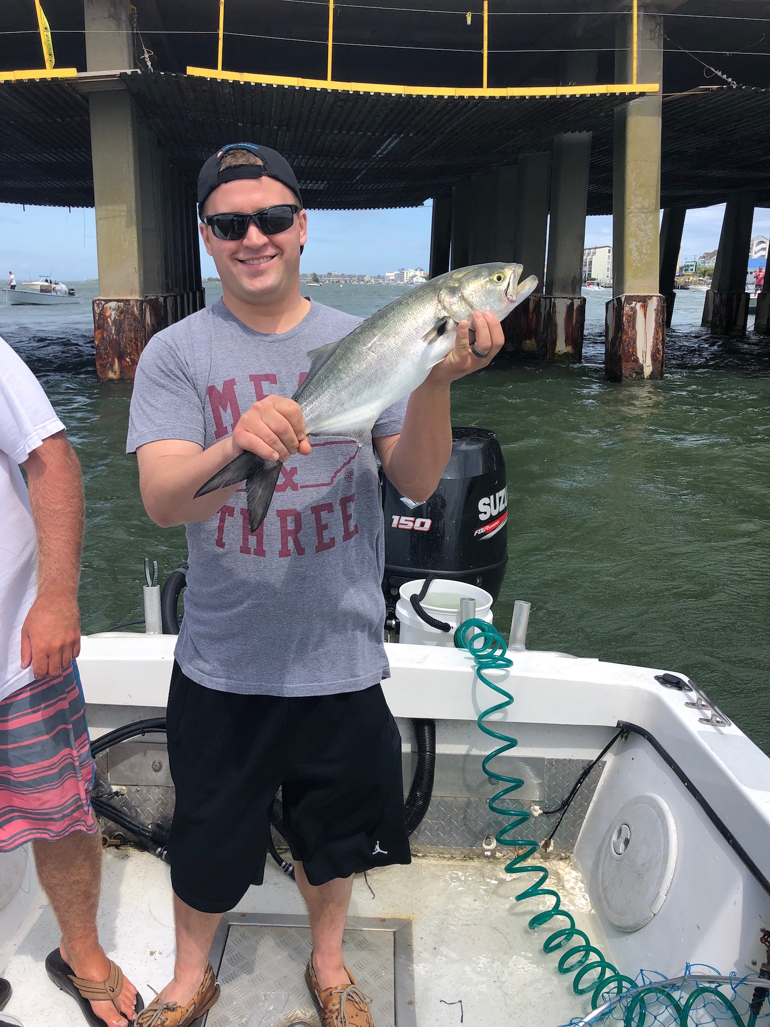 Captain Chase Eberle of Chasin’ Tides Charters had to stick to the bay today too so he pulled into the route 50 bridge as well and put his anglers on some great action with the bluefish and short stripers.