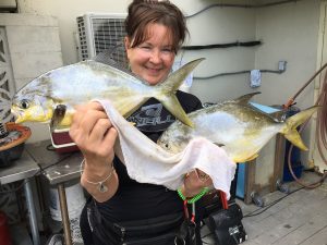 Bear down at the Oceanic Pier sent this photo of Christy who caught some reely nice pompano from the north sea wall while fishing with Fishbites bloodworm.