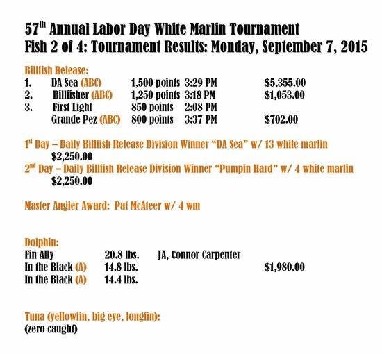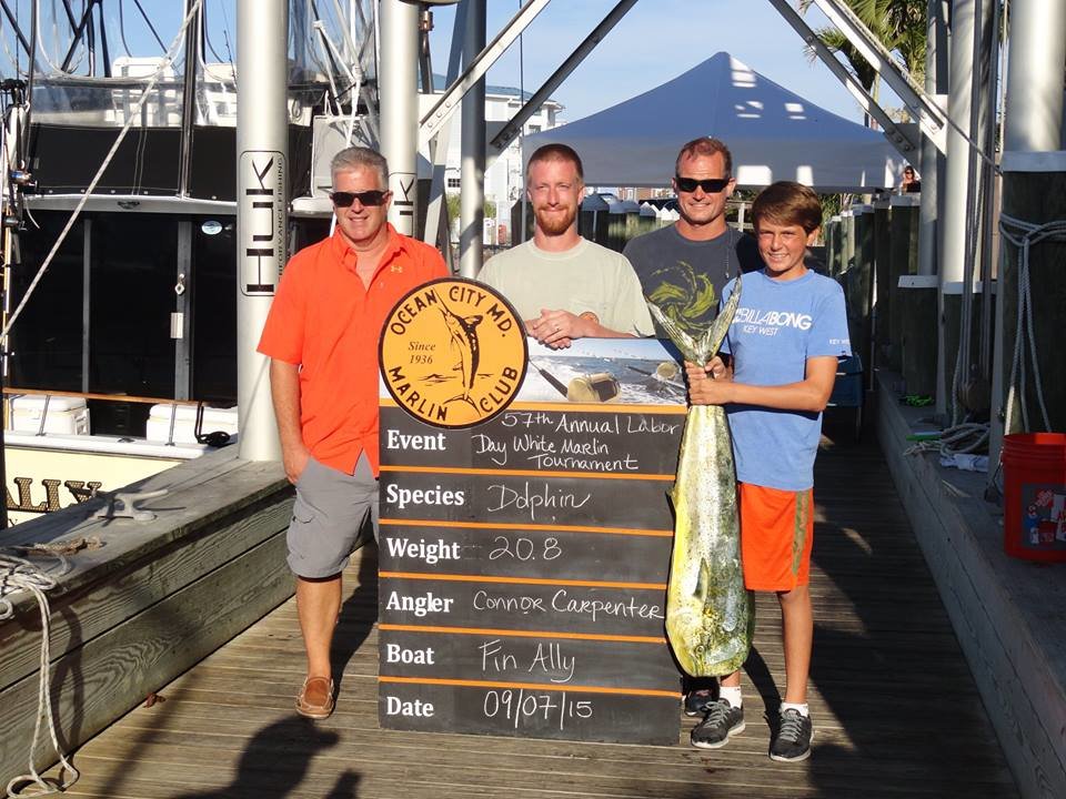 The Ocean City Marlin Club made a good call on Thursday when they added an extra fishing day to the 57th Annual Labor Day White Marlin Tournament. That decision turned this into a fish two of four day event that turned into a fish two of two day event as sea conditions on Saturday and Sunday were unfishable. Friday was a good day of fishing and today was a good day as well with 29 of the 30 boats registered heading out. The Fin Ally came in today to claim first place in the dolphin category and Pumpin Hard took the daily billfish release calcutta.