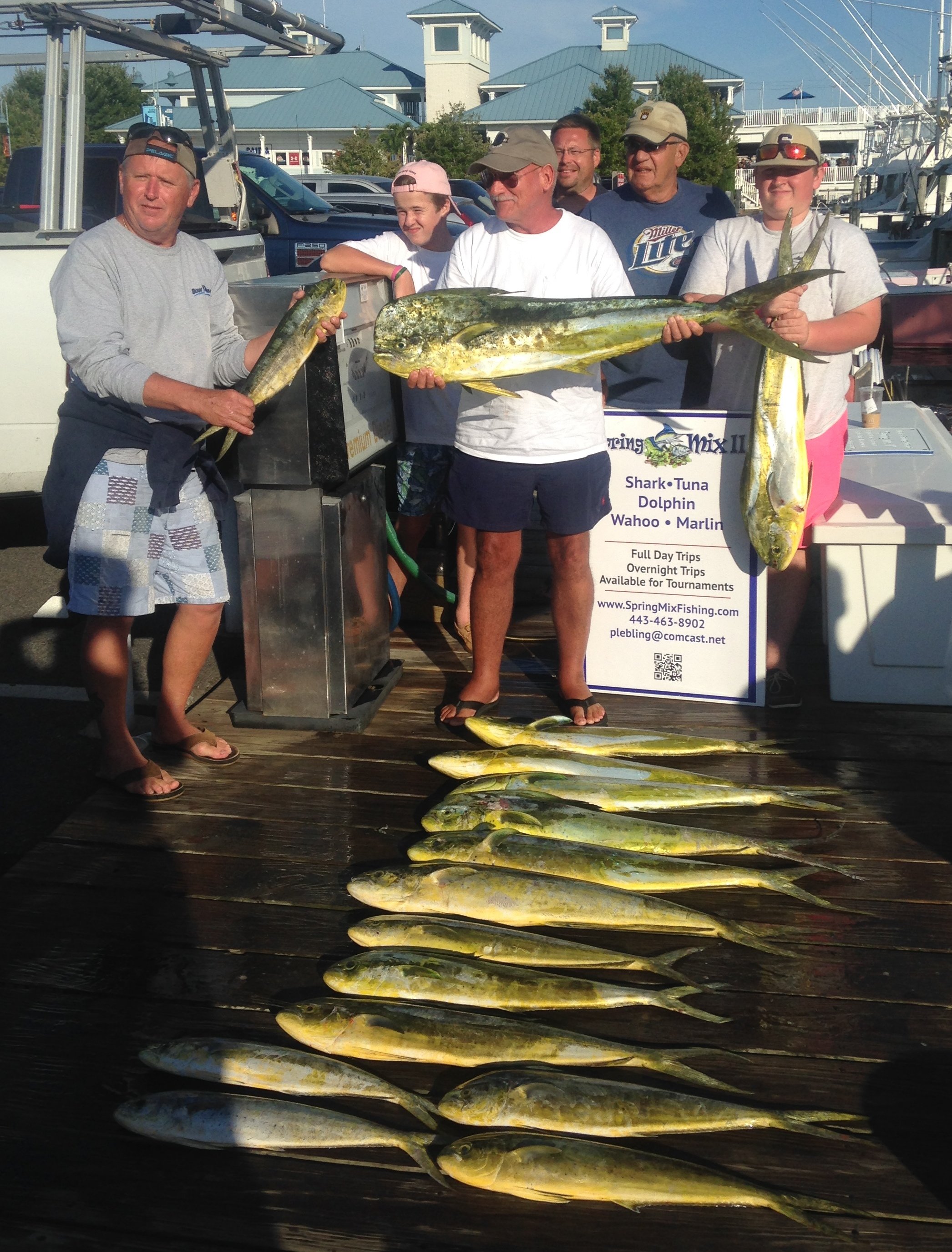 The guys on the Spring Mix II with Captain Chris Watkowski had a good day on the mahi as well. Owner Paul reported that there were as many dolphin as you wanted out there, but the party made a good decision and decided to stop at 15. That’s awfully conscientious and commendable to not take more than you know you’ll need. The 15 fish kept mates Riley McCabe and Ayrton Pryor busy in the cockpit as Captain Chris trolled the Baltimore today.