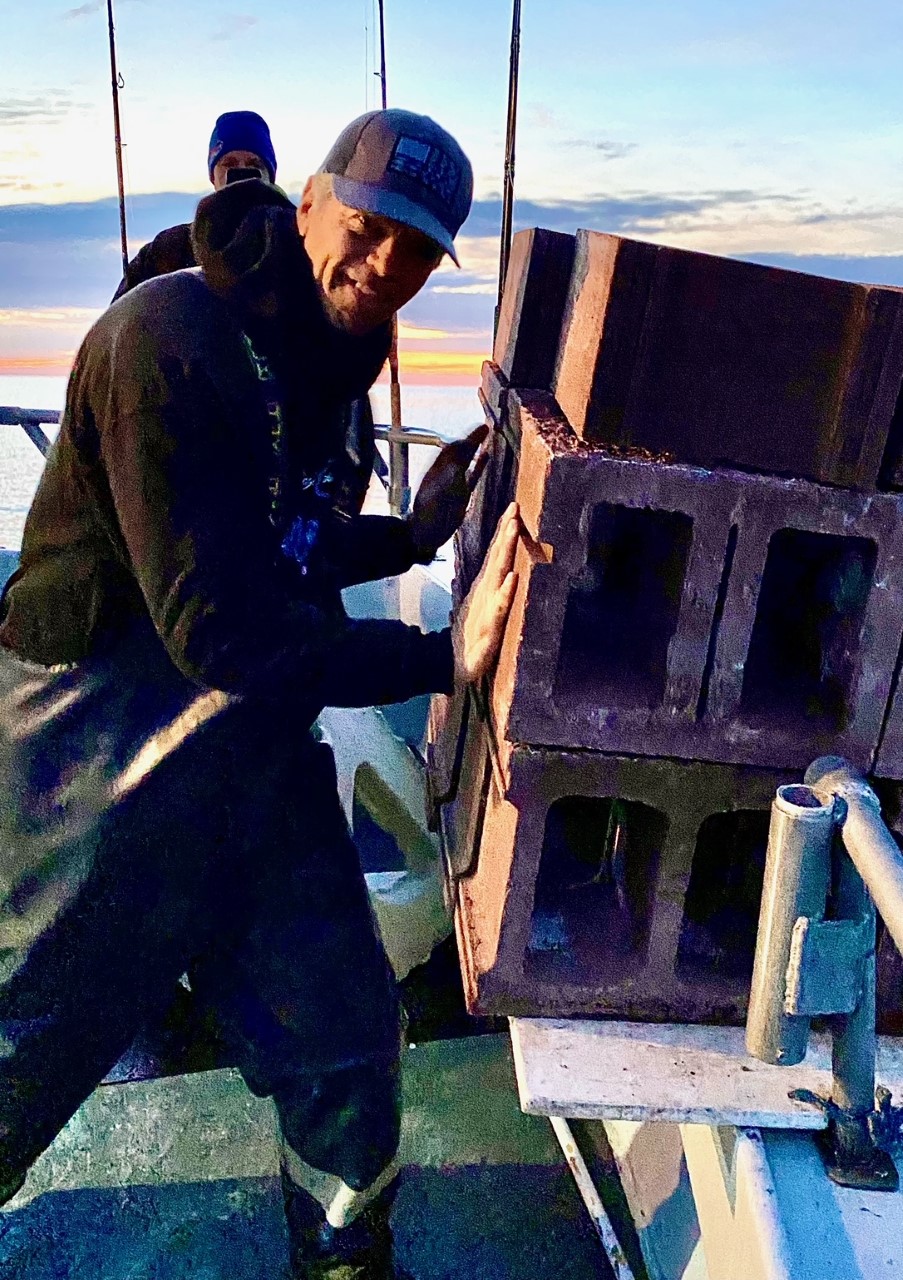 Long time tog fisherman, Alex had rounded up a bunch of my old regulars and some new fellows too – all were welk skilled blackfishermen.  He pushed 20 blocks & a pyramid by the rail just before sun-up. I expect Capt. Bob Gowar’s Memorial Reef will be used by fishers and divers for at least another hundred years – many hundreds if successive generations too nourish it with more cement or even larger projects.