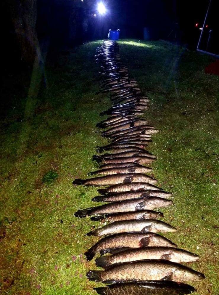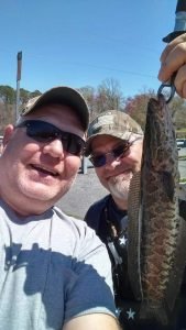 My buddy Sam Tudor and “Shorebilly” Hollie Robbinson who is a “true Eastern Shore redneck” fished off of the Choptank River today and were rewarded with some pretty good snakehead fishing. Sam and Hollie had at least one nice largemouth bass and several snakeheads that were caught on the good old live minnow and bobber combo. Sam also reported that a couple of guys fishing hard for just two days caught over 200 pounds of snakehead. It looks like snakehead have made a permanent home on DelMarVa which is a big problem since they are an invasive species that can do some serious harm to local fish populations. MD DNR wants snakeheads dead so if you have any interest in fishing for them go right ahead, there are no size or creel limits on them….thankfully I hear that they are very good to eat as well so the meat should not go to waste.