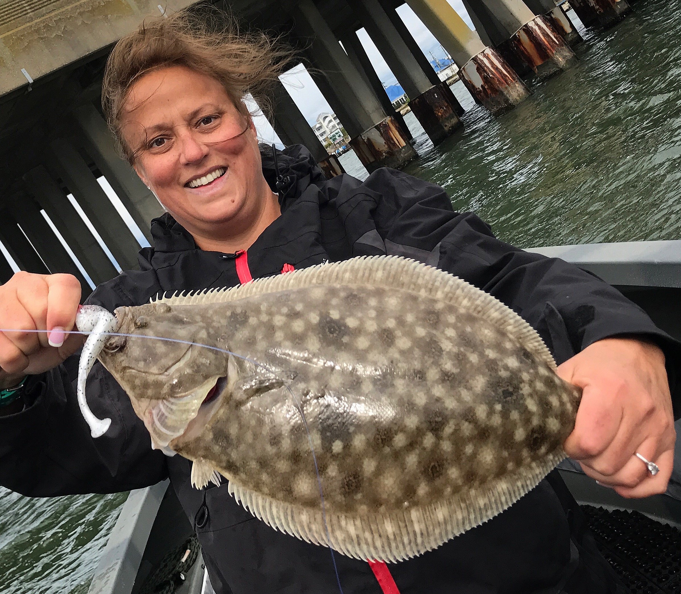 After the fleas ran out it was over to the route 50 bridge with Big Bird’s World Famous Roy Rig where Karen’s first cast rewarded her with a healthy 18.5″ flounder that went in the box. Captain Jeff added some more snapper bluefish and some short rockfish for an epic day of inshore fishing.