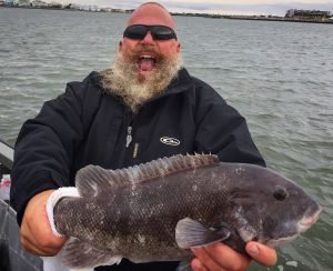 It was Karen’s day off today so Captain Jeff Coats of Pitboss Fishing had his fiance’ out for what turned out to be an epic afternoon of inshore fishing. Captain Jeff and Karen started at the south jetty where they caught some snapper bluefish and tautog on just about every other cast. By the time they ran out of sand fleas they had caught several small blues, a sea bass, a black drum, a bunch of 13″ to 15″ tautog, two tautog that landed right on 16″ that were released and one 19″ that ended up in the box.
