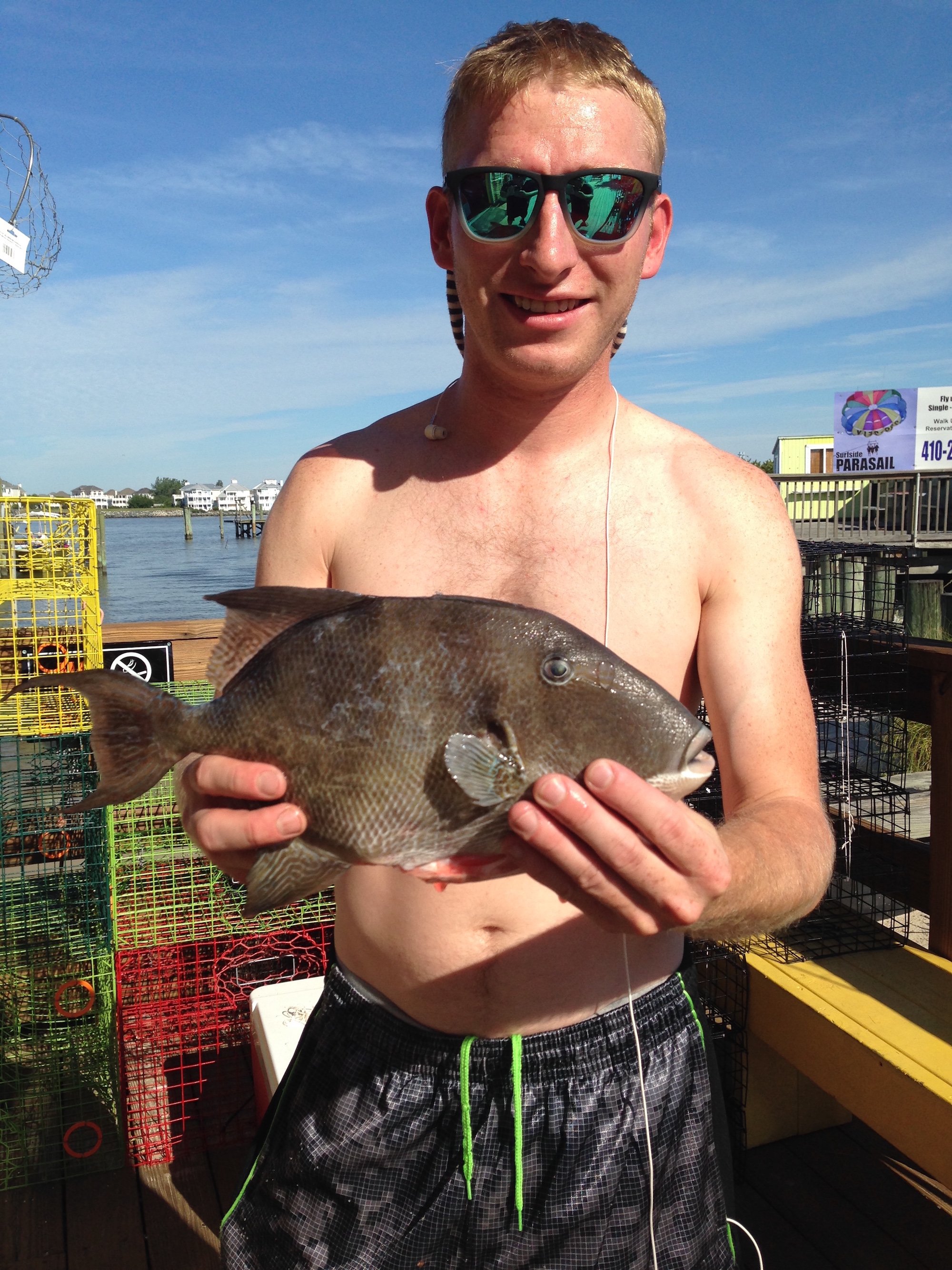 Bear at the Oceanic Pier in downtown Ocean City submitted a photo of Noah from Scaggsville, MD who caught a big 14″ triggerfish from the north sea wall on a sand flea.