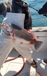 “I’d bet this bottom we fished Saturday has had only nature to deal with over the years. Whole Jonah crabs were getting inhaled within five seconds the entire time. Limited out in a little over an hour and left them to figure out what just happened. Covered up with big fish with over twenty 10+lb fish released with personal bests all around. Giant sea bass harassing us too. Good end to tog season.”