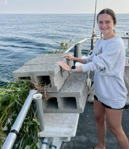 We stopped at Lucas Alexander’s Reef where Ms Lexi deployed a bamboo/block unit and same with two pyramids. Mate Joe took a secci disc reading of 6.5 fathoms visibility. Water quality continues to be extraordinary off the DelMarVa coast.