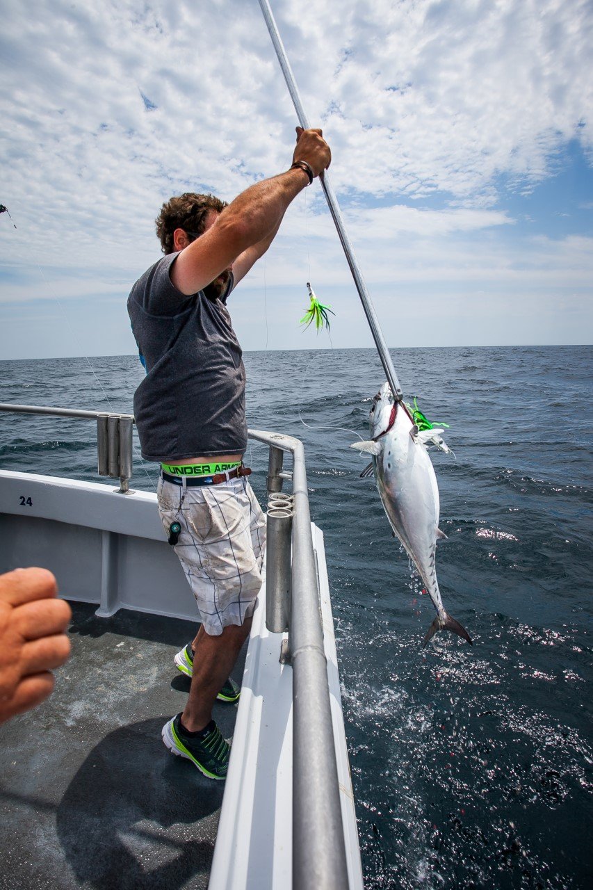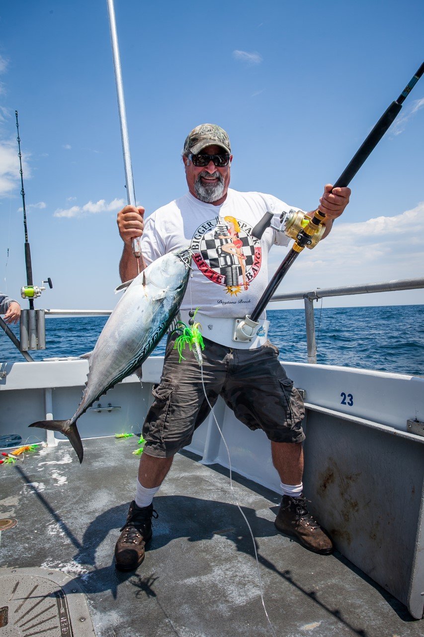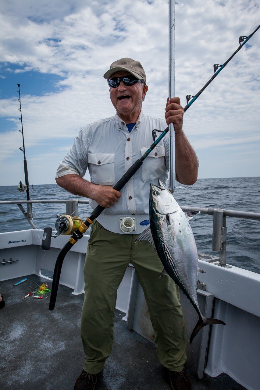 I got a report from Wes Pollitt of the Morning Star with Captain Monty Hawkins with some info that you don’t see on a regular basis from a party boat.  Wes reported that they had great fishing yesterday, the high hook on the boat had 11 nice sea bass and they caught all day long.  Wes even managed to catch a nice 19″, 3.75 pound sea bass himself.  That’s not the out of  the ordinary stuff…but what Wes reported about their catch on the way home doesn’t happen every day on a party boat out of Ocean City.  It seems the Morning Star was able to troll up a couple of false albacore on the ride home and lost another bite that didn’t come tight.  Cool stuff!!