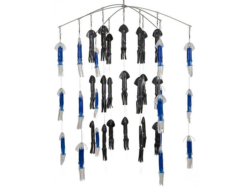 The most productive way to catch a White Marlin is to lure it to the boat using hookless teasers and then switching the teaser for a small hooked bait to feed the Marlin. My favorite teasers for White Marlin are either a chain of rubber squid rigged in a row with a ballyhoo behind them or a specialized teaser called a dredge, armed with rubber squid or natural baits like mullets or ballyhoo. The dredge is similar to an umbrella without the fabric, turned backwards, with multiple hookless baitfish or rubber squid on each of the wire arms. (on a side note, in the author’s humble opinion, Squidnation produces the best rubber squid and dredge products- check them out at www.squidnation.com)
