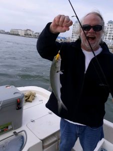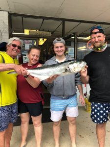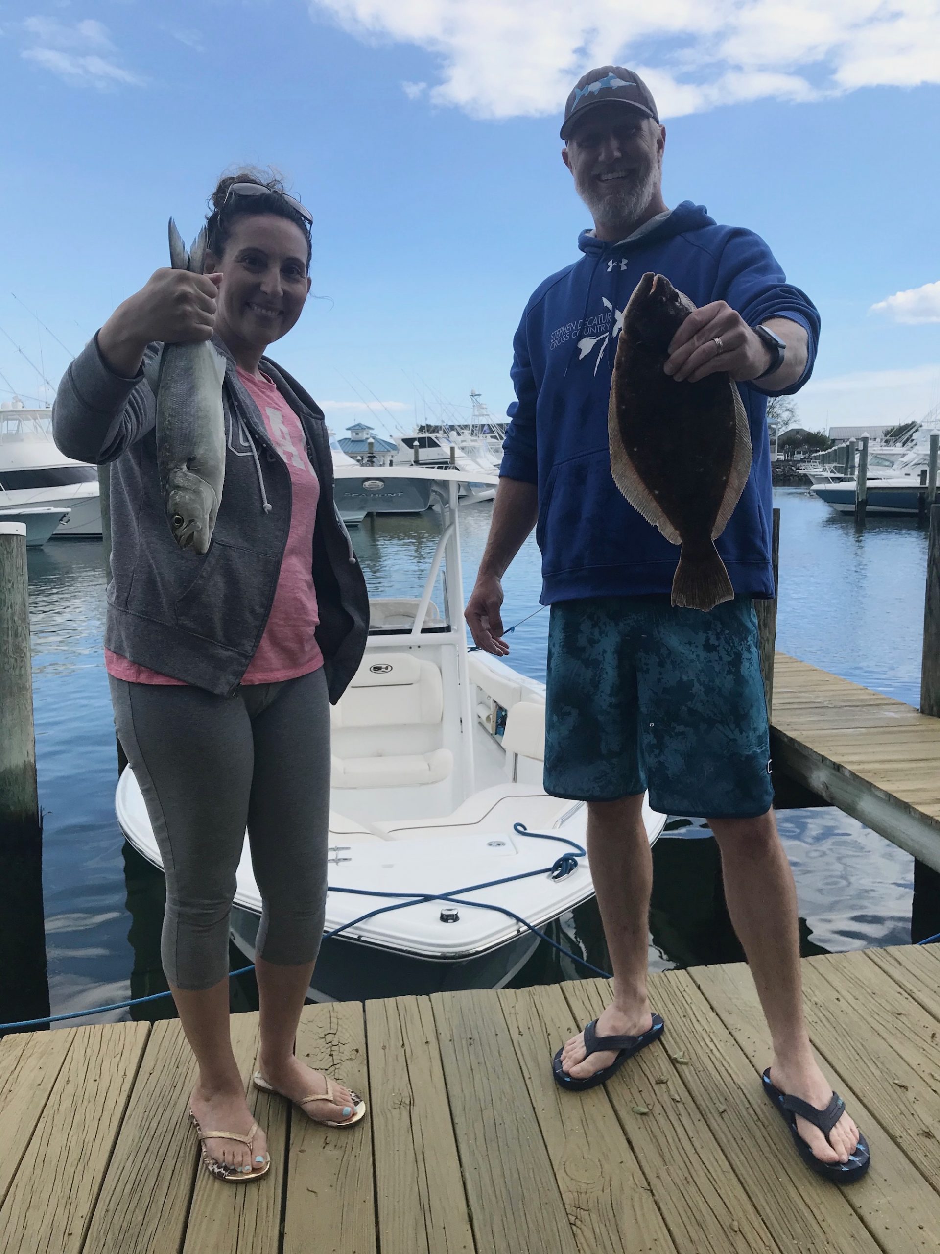 I got to do a little fishing with my wife Kristen this afternoon and I have to say I was pleasantly surprised by the water clarity. We only fished a few hours, but managed some throwbacks and one 17″ keeper on our pink and chartreuse Deadly Doubles with different colored Gulp baits. We saw Ryan Cowder fishing with the family just down the bay and they sent this photo of an 18″ keeper and a bluefish that they caught on the Deadly Double as well.