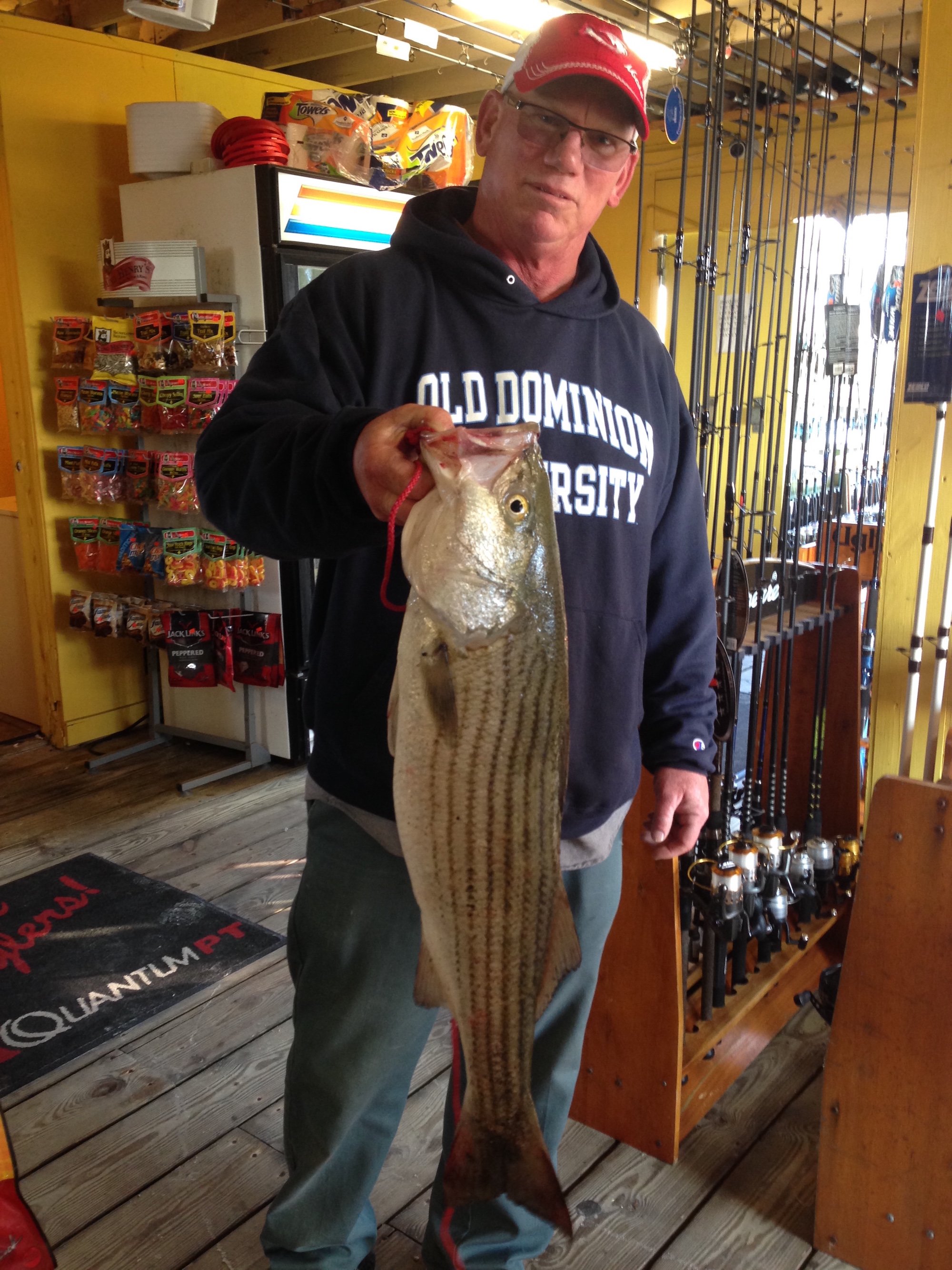 Bear from the Oceanic Pier submitted this photo of Andy from Milford, DE who caught this 29.5″ rockfish on a Tsunami swim shad this morning on the route 50 bridge.