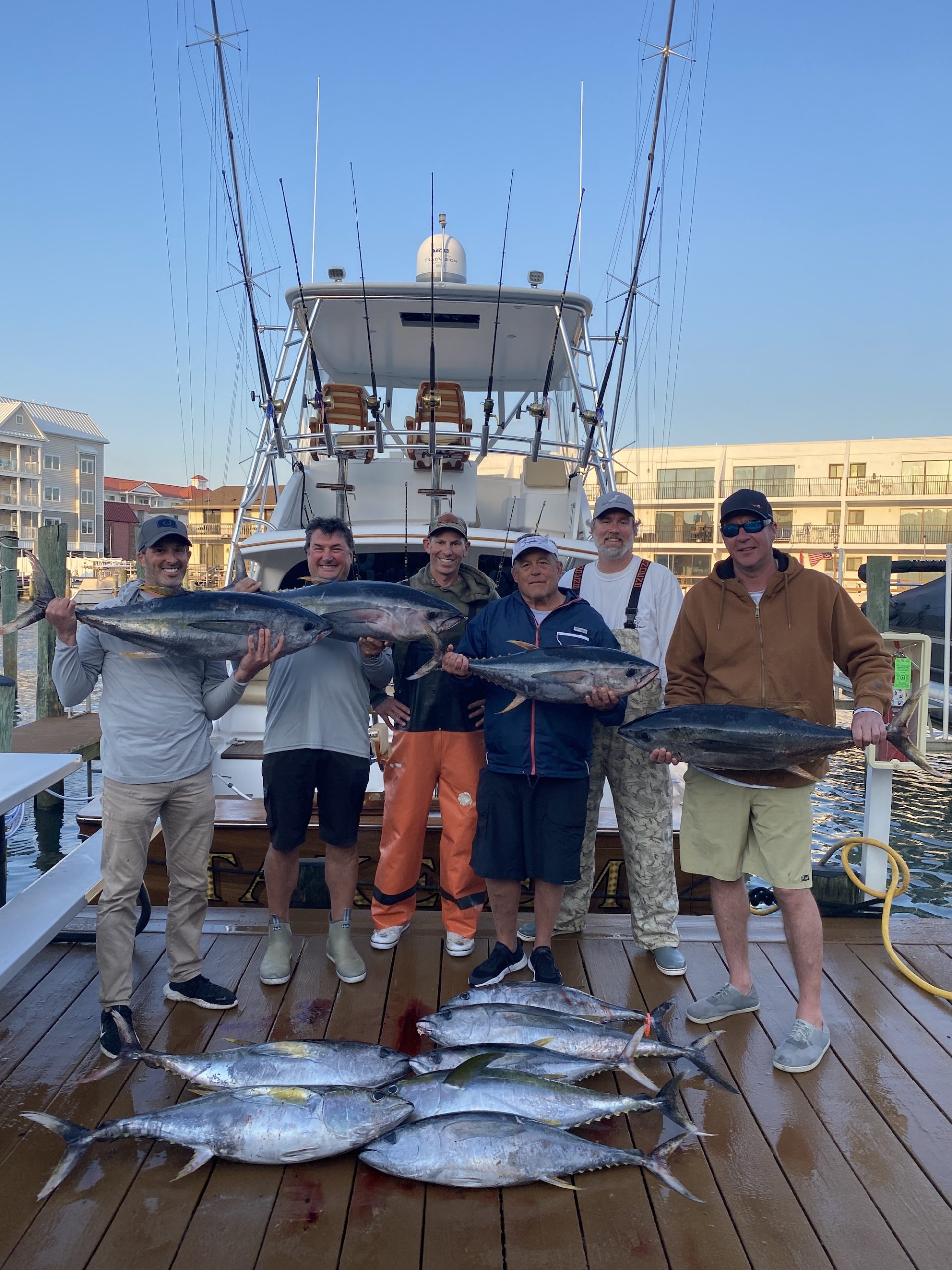 That’s right. The first bluefin and yellowfin tuna of the Ocean City season were caught today by the same boat. Captain Skip Daisey, owner Richard Osborne, Thad Bittner, Andrew Dietz, James Haren and Pete Roskovitch of Adam’s TapHouse fished on board the Take Em out of Harbour Island and landed the first bluefin tuna of the season and the first yellowfin of the season. The crew also added another nine yellowfin for a total of 10. The fish were caught on skirted ballyhoo in 800 fathoms southeast of the Poorman’s Canyon. Pretty work fellas! Thanks to Austin Ensor of Primary Search and Dakota Bittner for the intel!