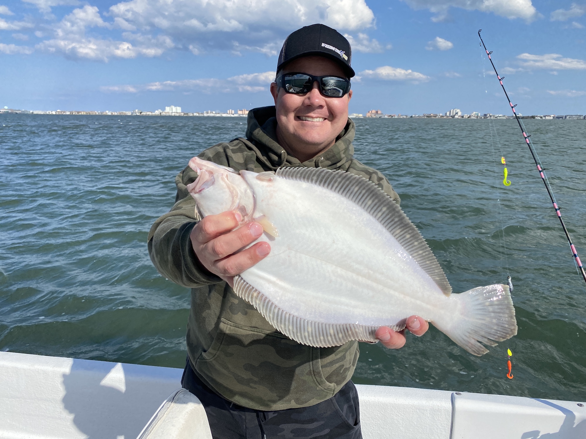 We weren’t planning on going fishing today, but when we delivered some rigs to Pines Point Provisions we noticed what we thought were decent conditions on the bay. Even though I was planning on doing some power washing I left the decision to go up to Kristen and she said, “F$%& it! Let’s go!” The plan was to try for the first flounder of the season for a little bit and then go back to route 90 to try for rockfish again, but when we got out into the bay that plan almost changed. The wind was blowing out of the northwest at 20+ and the bay was white capping so we almost turned right around and docked the boat…..I’m really glad we didn’t! We headed to a spot that Kristen chose and when conditions were worse there we decided to do one drift since we had made the trip and then head back home. The first rig went to the bottom…..with 4 ounces of lead!…..and then I placed it in the rod holder. I dropped my second rig to the bottom and had just clicked the bail closed when I turned around and saw my JPR custom with a bend at the top that was twitching like a flounder had jumped on. I said to Kristen, “I think that’s a fish!” and picked up the rod where my suspicion was immediately confirmed. After about a 2 minute fight I had the first flounder of the 2022 season in the net and went a little ape poop after it hit the deck. I’ve been fishing in OC for around 30 years and this is the first time I’ve ever caught the first flounder of the season….it was awesome!! Now the important info for you flounder fishermen. I caught the fat 18″er on the Fish in OC Deadly Double in chartreuse with a 5″ white Gulp in 8′ of water in the Thorofare. Water temp was 51.5 degrees…..and damn was the wind blowing!!