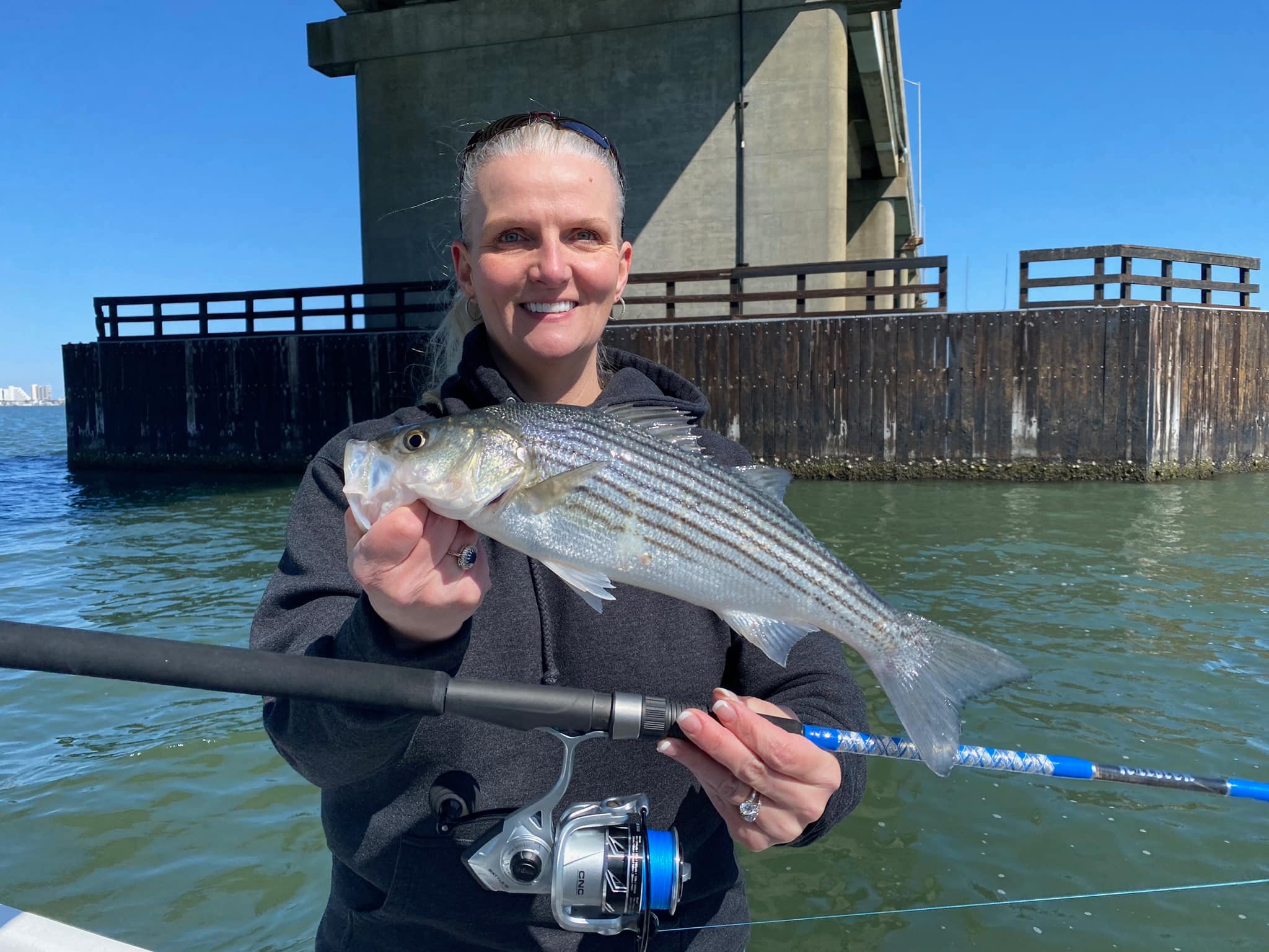 Yesterday we had a great day of fishing at the route 90 bridge where we caught and released 12 small rockfish on our Fish in OC Thing A Ma Jig. It was Kristen’s first trip of the season so it was nice to get some fish under the belt.