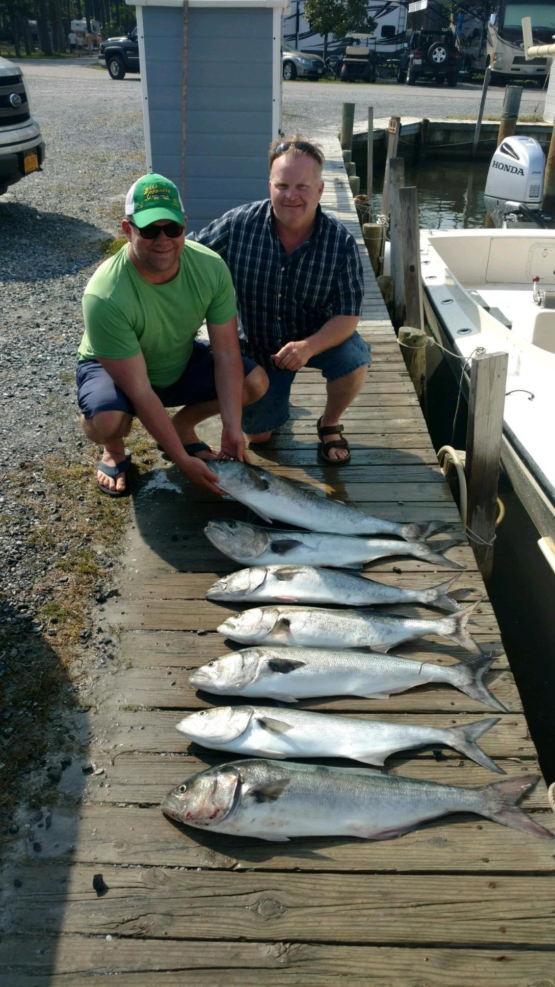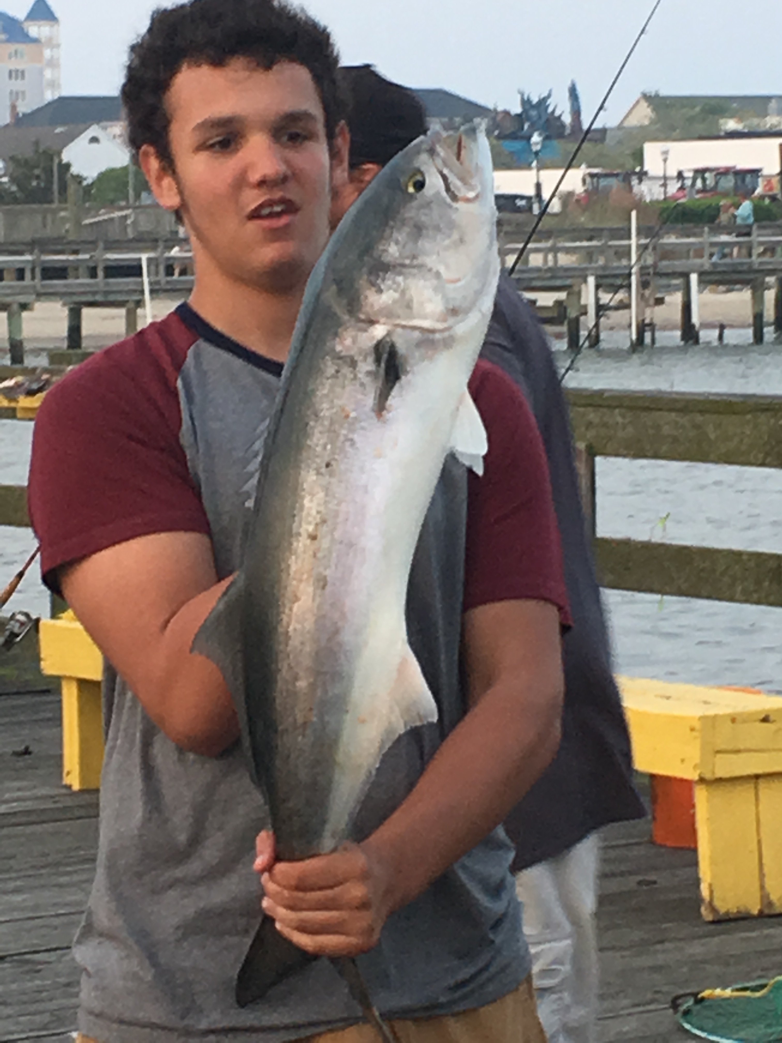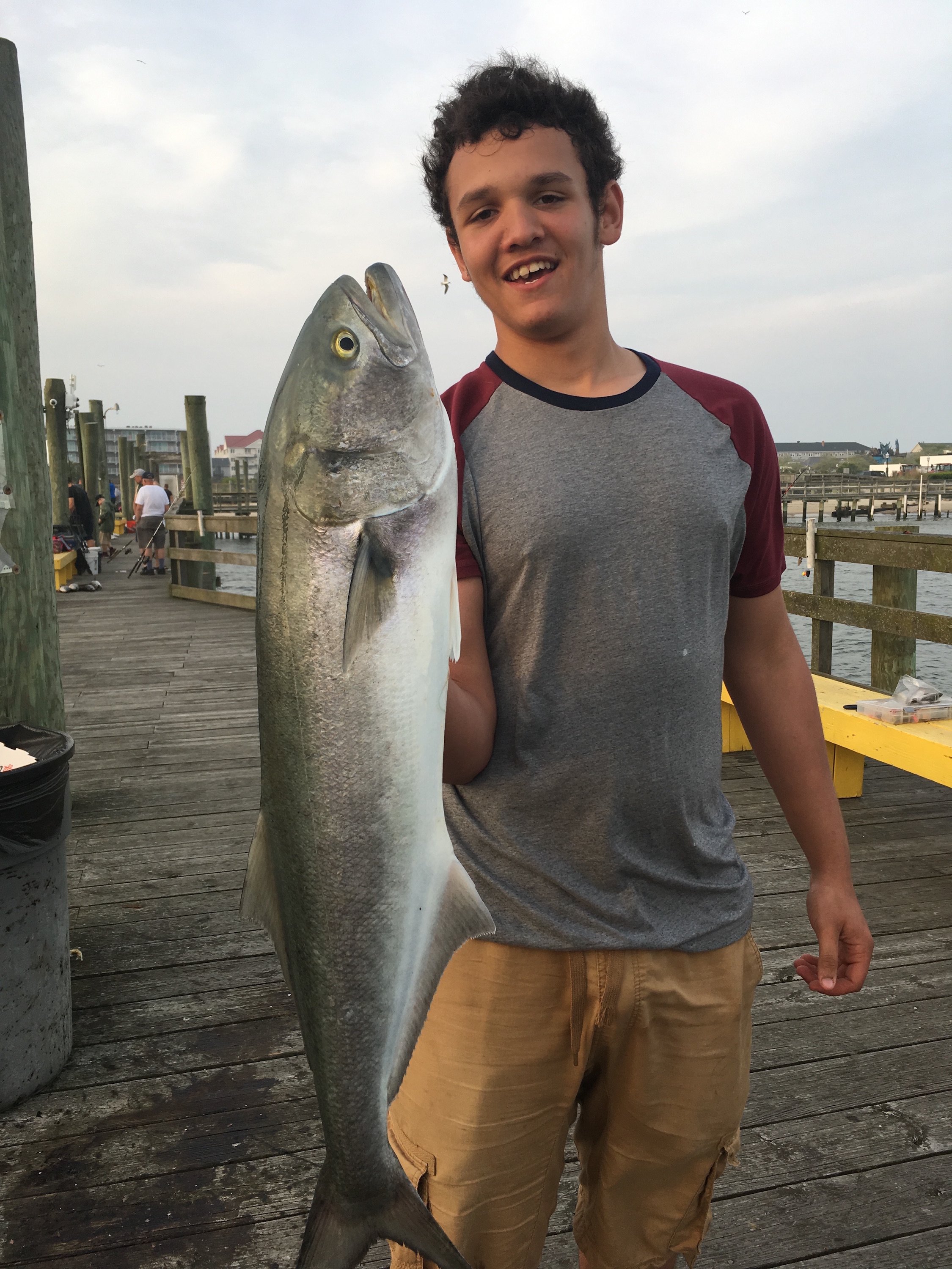 Bear from the Oceanic Pier just sent in a couple of shots of his son Joshua with his first ever big bluefish that he caught at his dad’s favorite spot.