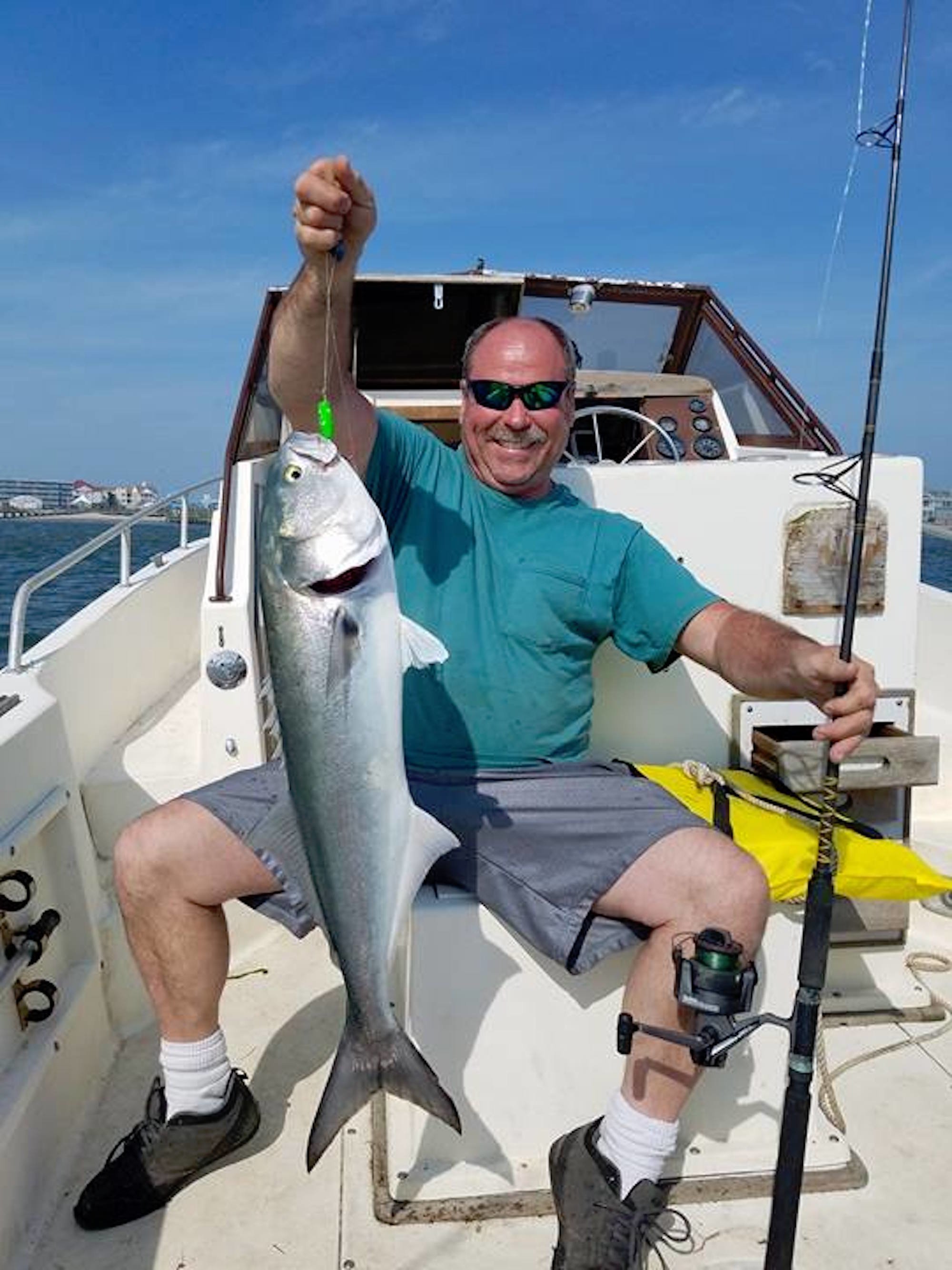 The bluefish action all around the surf, inlet and back bays is really incredible right now. Anglers are catching 10+ pound bluefish like it’s the easiest thing in the world…..I haven’t seen a blitz like this in my 25 years of fishing in Ocean City. Chris Shamblin who is a regular at the Oceanic Pier sent me a couple of photos and a report from the pier and it is pretty remarkable. Chris reports, “the gator bluefish are hitting double drop rig blue fish rigs extremely well with cut bunker at the pier. Seems like bunker is outfishing mullet 3-1. Also it appears the bigger blues prefer cut bunker over any lure or jig thrown. I saw 57 bluefish being carried to the fillet station in a 2.5 hour time period. Guys are catching nice gators off the 611 boat ramp pier and beach to the left of it on cut bunker as well.” Below Scott Kemm of Severn, MD shows a nice fish that he caught on the pier.