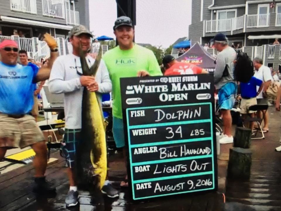 After some movement in the dolphin category the third place fish is a 34 pounder caught by Bill Haugland fishing on board Light’s Out. Bill’s fish is currently worth $2,000. WMO fish mover and weigh master Alex dropped a pretty good photo bomb on the crew.