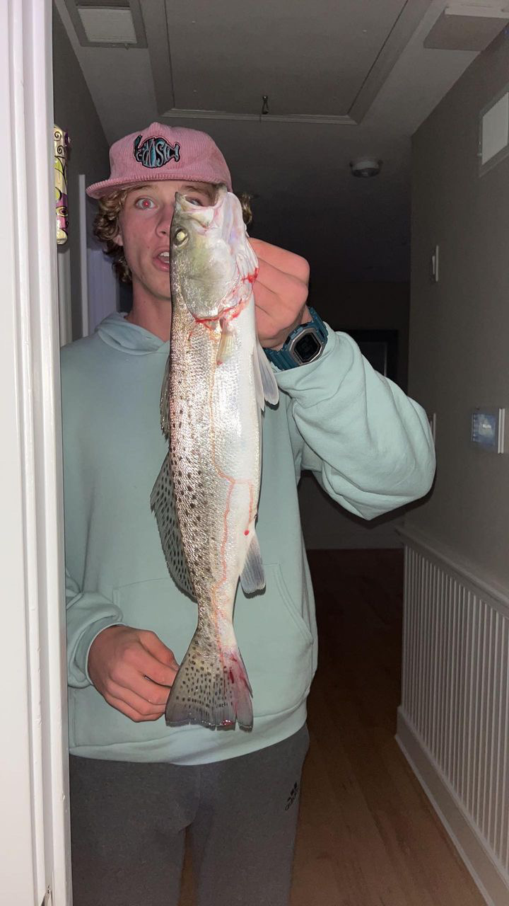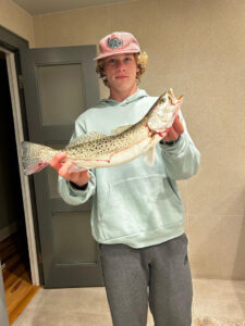 Our very good friend Dillon Scopp decided to go fishing for a few before starting his homework this evening and was rewarded with the first speckled trout of the season. Dillon was throwing a YoZuri suspending lure that enticed the nice 23″+ “speck”. The shock still hadn’t worn off by the time Dillon was able to take some pics in the hallway. Nice work Dill!