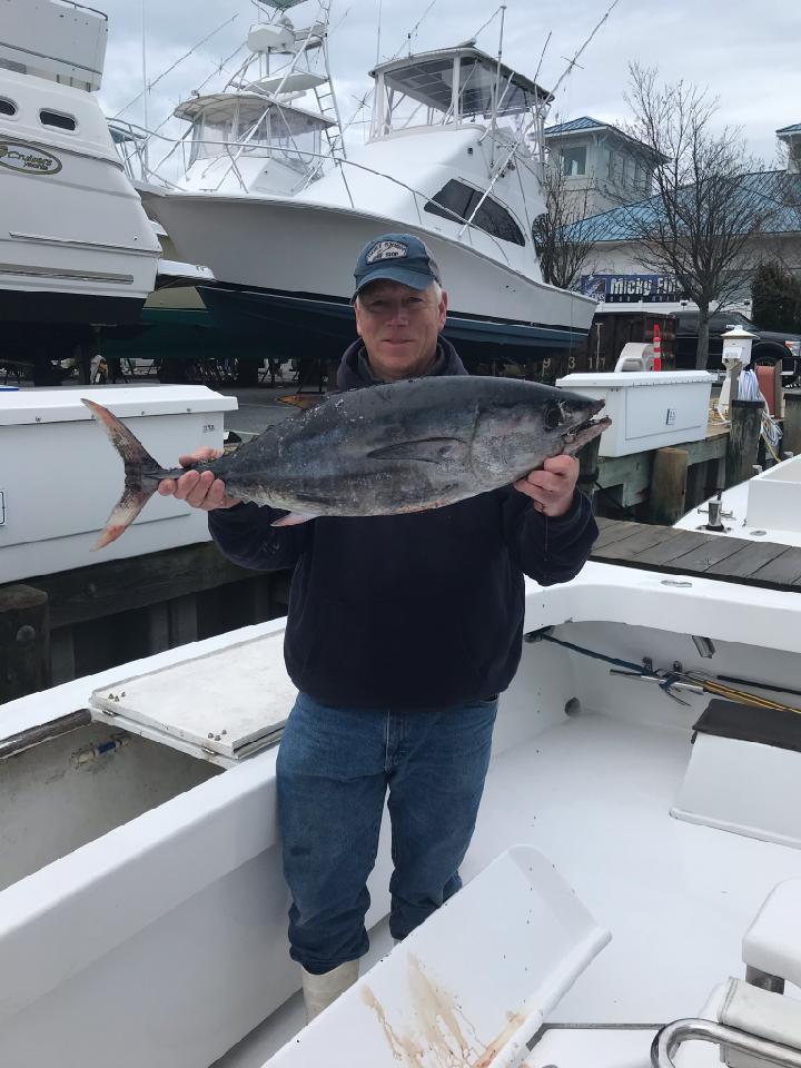 As boats have gotten bigger and technology has gotten better we have seen a major increase in early season offshore fishing trips for tuna and other species. Before the days of 60′ rigs that run 40+ knots and satellite imagery that can give us accurate water temperatures, boats weren’t usually heading to the canyons until at least June. Now anglers can get up to date information on offshore water temperatures and other conditions (Fish in OC Weather and Sea Temps) and boats have become so fast and efficient that the canyons are no problem even in the early season. Yesterday Captain Chris Little of the Talkin’ Trash out of the Ocean City Fishing Center took one of those early season scouting trips to the deep and was rewarded with the first tuna fish of the Ocean City season. Captain Chris and crew headed 68 miles to the edge where they found three bluefin tuna and then ventured another 18 miles to the east where they were 3 for 6 bites on yellowfin tuna. Unfortunately none of the yellowfin reached the 27″ minimum size, but it was still a great trip and a good sign for the upcoming season.