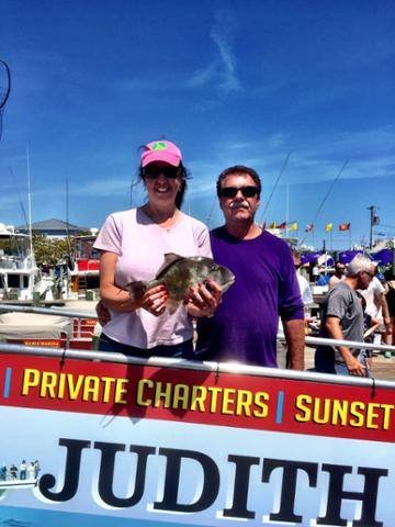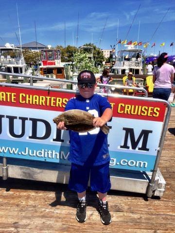 When it comes to the inshore flounder fishing you have got to be in the ocean on a wreck because the flounder fishing in the bay is bad. There is usually a few weeks toward the end of the summer when the water temp and clarity are just not what the flounder like and that time is now. There are fish in the bay, and you can catch keepers, but it’s not good. However, the wreck and reef fishing for flounder is really good right now. The inshore party and charter boats are going to the wrecks when they can, and they are having luck. Here is a young angler from the Judith M with Captain Don Hetherington holding his keeper flounder from the morning trip, and a nice triggerfish from the afternoon.