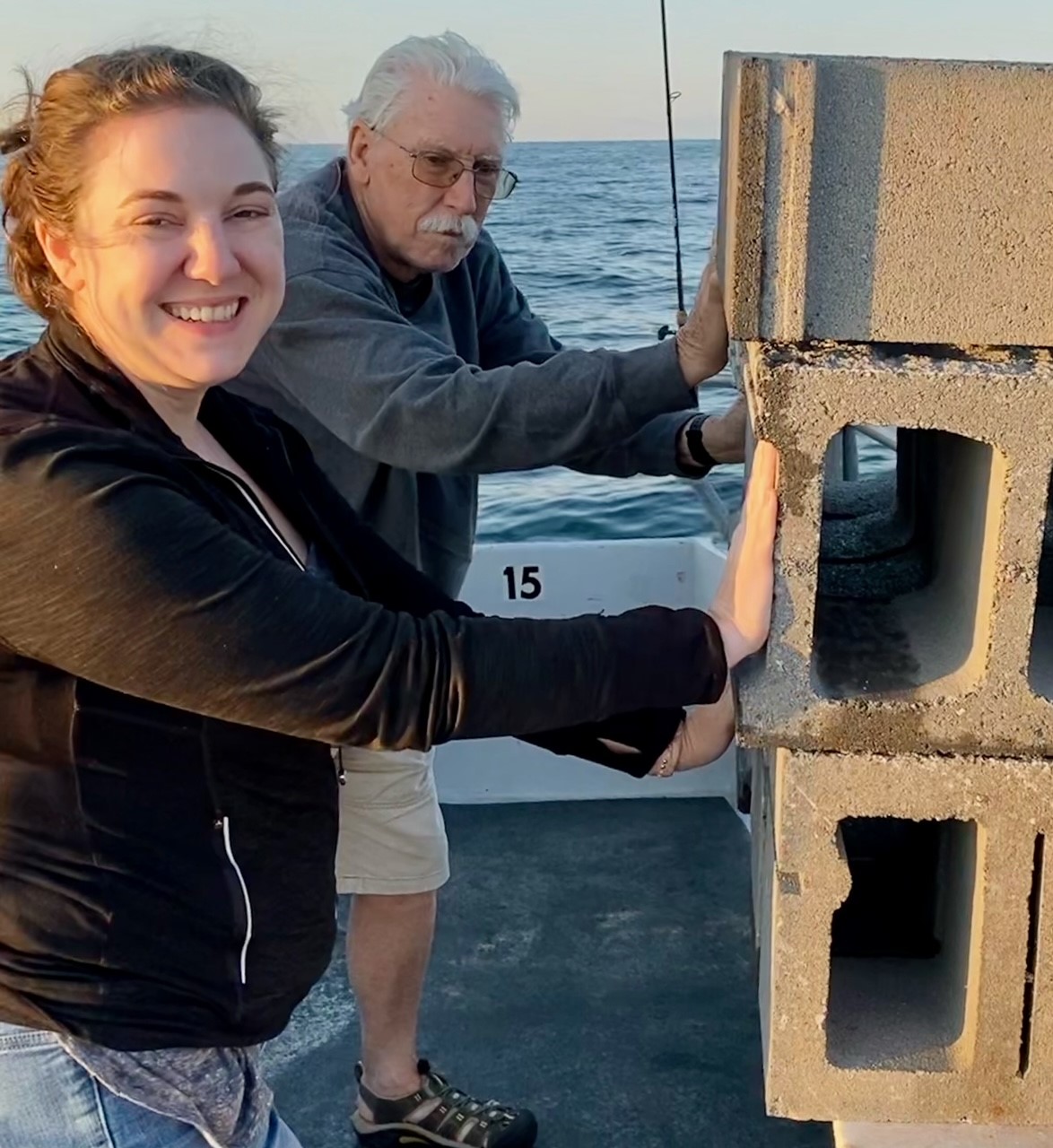 Covid done and mechanical tasks squared away, was a fine day to return to our task. We found winds nearly calm and seas but a ripple; moseyed on off to Tyler Long’s Memorial Reef where Katie & Tom G deployed 20 reef blocks – loose – within the 120’ barge named in Tyler’s honor.