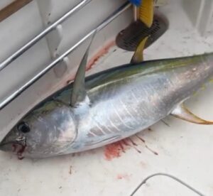 First thing this morning I got an Instagram message from Taylor at AlwaysBentFishing with a cool video and the following thumbnail that said the first yellowfin of the season had been caught. I haven’t gotten the details from Taylor yet (probably sleeping after a long day :), but the video and photo are confirmation that the Full Service caught at least one yellowfin tuna this morning so hopefully this is a sign of things to come!