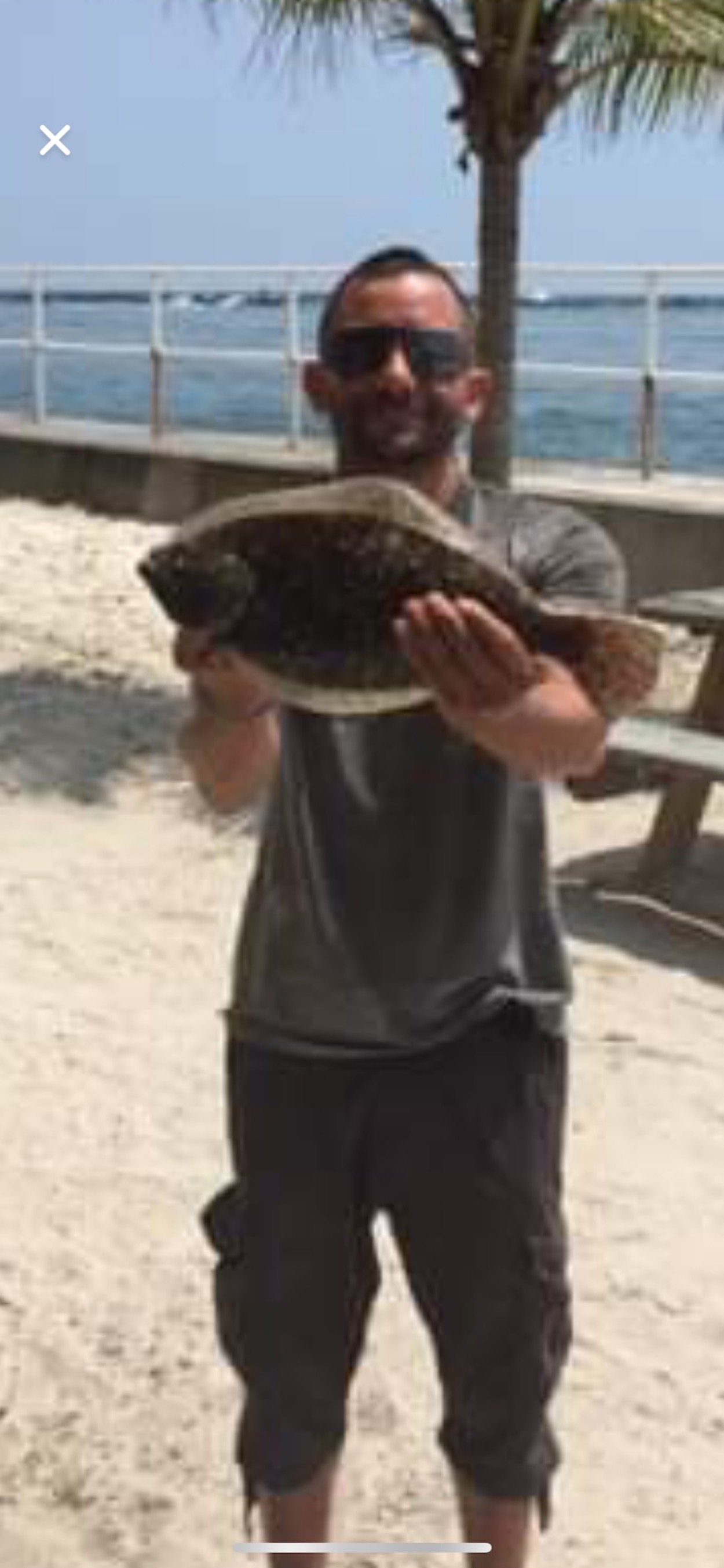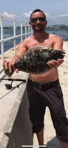 Bear down at the Oceanic Pier sent in two photos of Anatoli Georgiev who was fishing the north sea wall when he landed keeper flounder of 17″ and 18 1/2″.