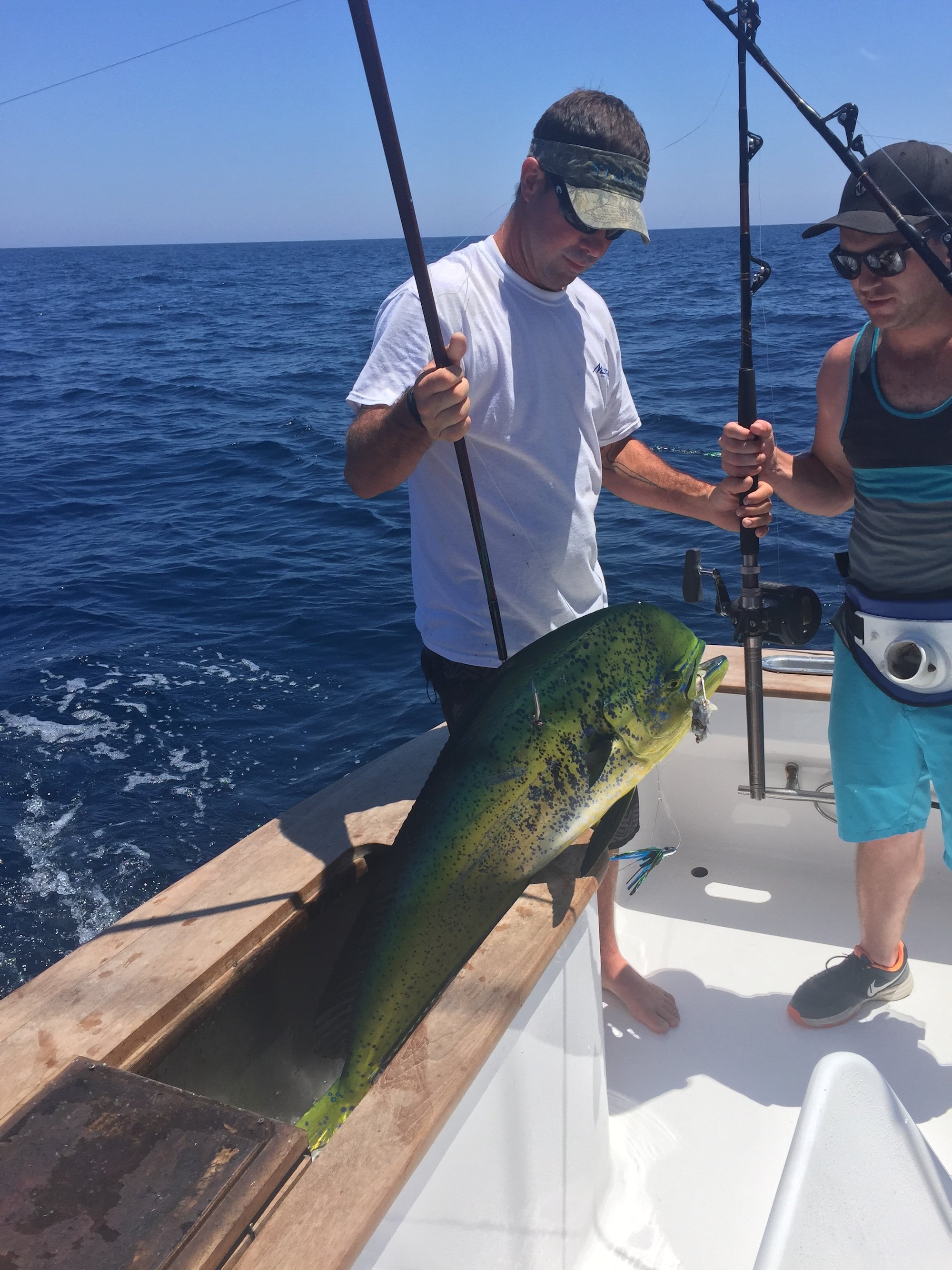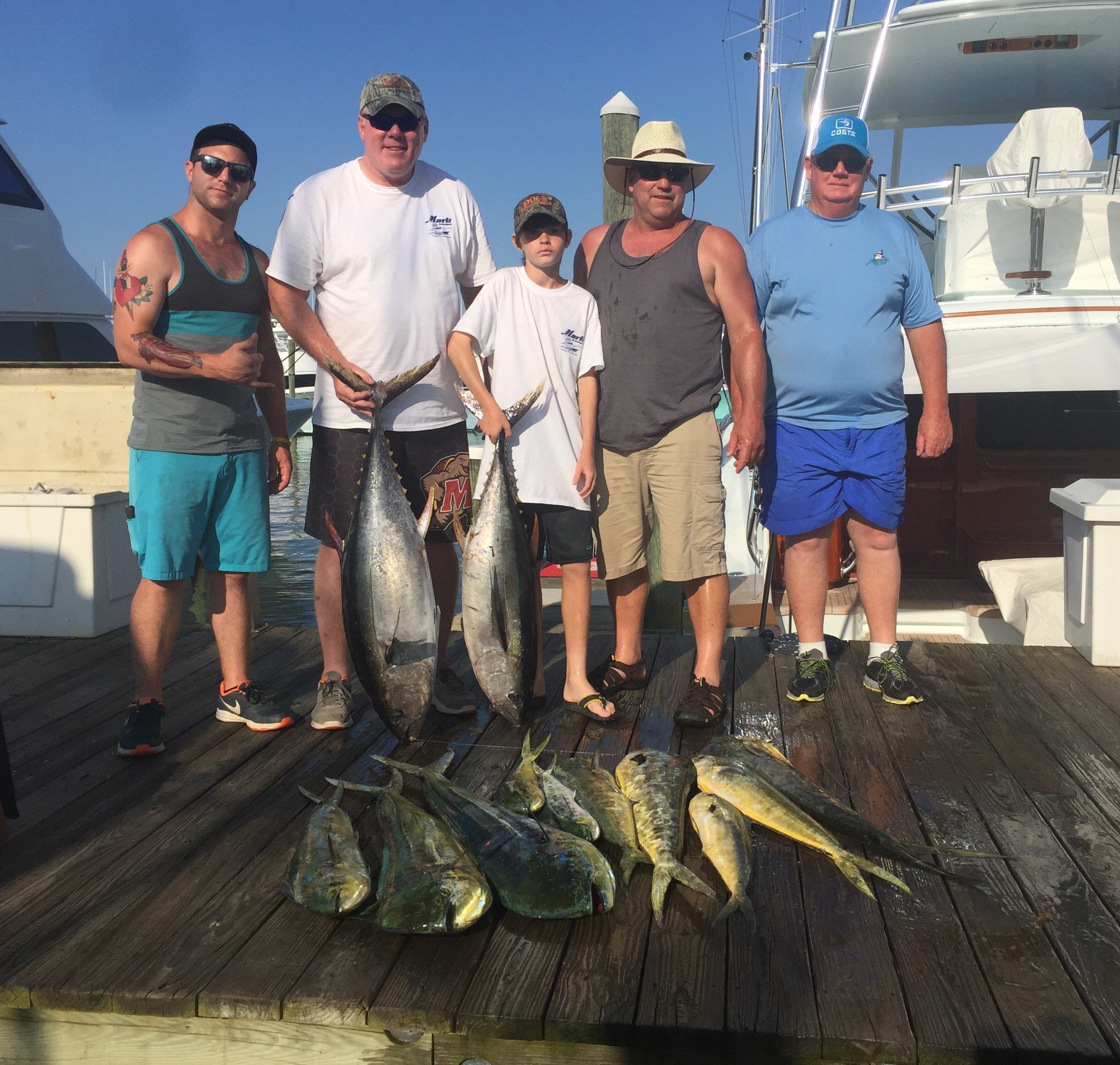 All in all we ended up with 10 Dolphin, including a 20 pounder, and two nice Yellowfin. It was a great day on board the Marli with Captain Mark Hoos, Mate Mark Stephens, owner Mike Bostick, “Little” Mike Bostick, John, “Little” John, Spence and Aiden. Aiden was our 12 year old angler that caught his first offshore fish!