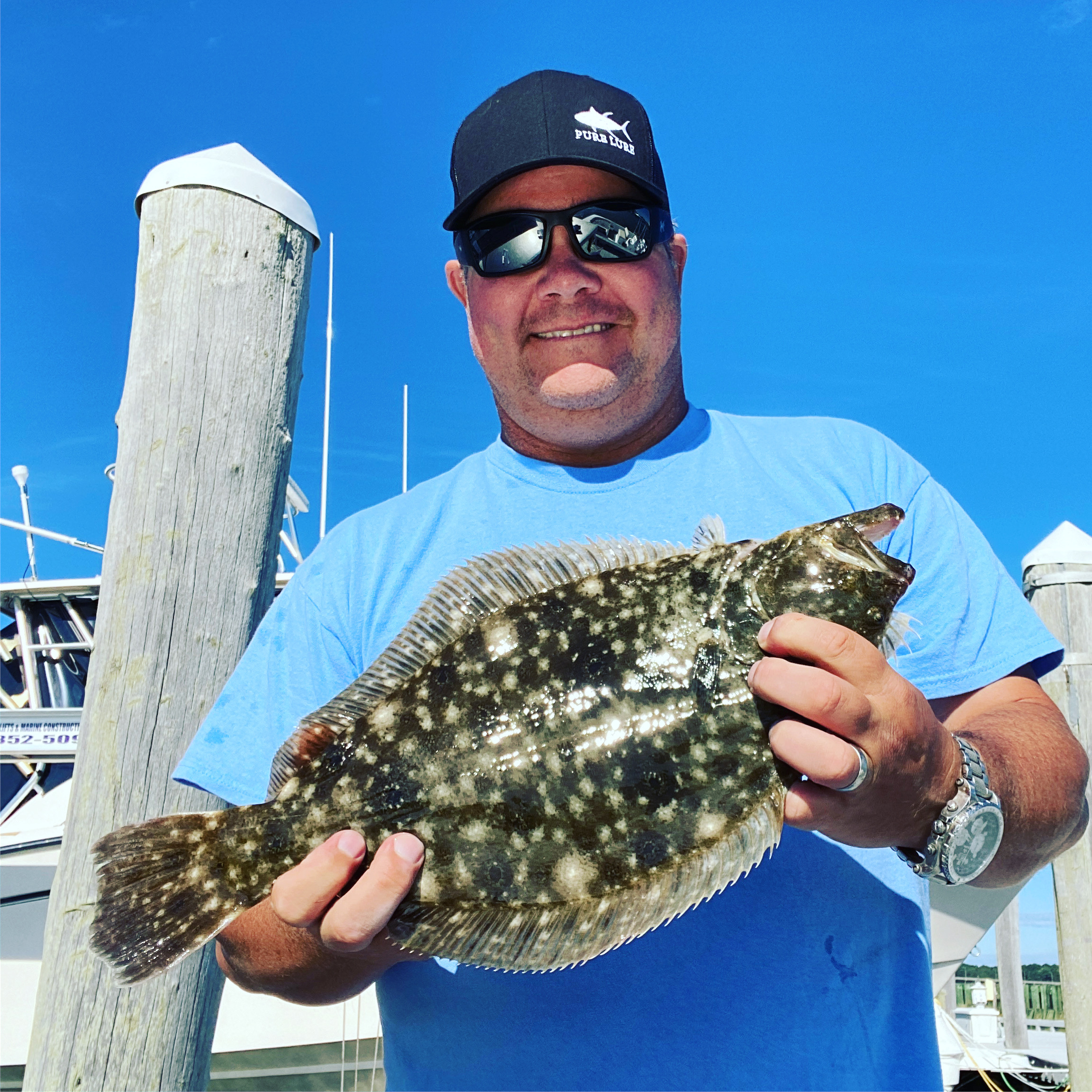 It was a beautiful day on the water today with sunny skies, not much wind and awesome fall temperatures. It was too good to pass up….so I didn’t. I took the Fish in OC skiff out for a few hours this afternoon with some live bunker and our Fish in OC Live Bait Rig and had some luck catching some flounder down by the route 50 bridge. Four throwbacks and a fat 19″ fish were plenty of fun in the not so great water conditions.