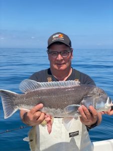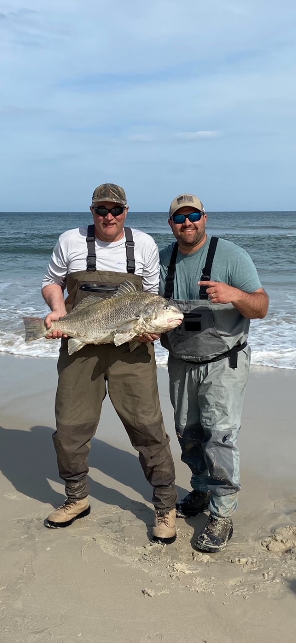 Steve Sweigert was fishing the suds of Assateague Island today with his dad Ken Sweigert from “the middle of nowhere” Wellsboro, PA and had some luck. Steve was able to put his dad on his first ever black drum today while wearing his awesome Fish in OC swag.