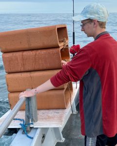 What a fantastic ocean today. Nice as you could want – calm, no wind chop. We dropped blocks and a terracotta togominium unit on Capt. Bob Gowar’s Memorial Reef and kept going.