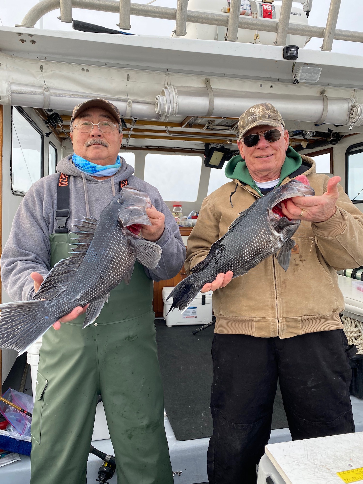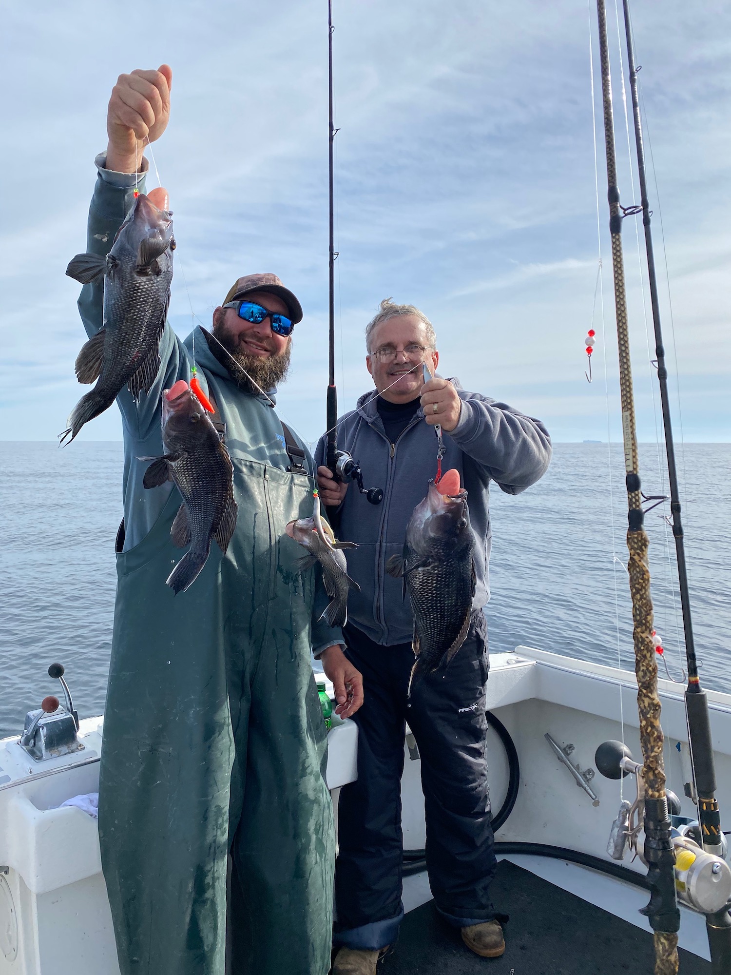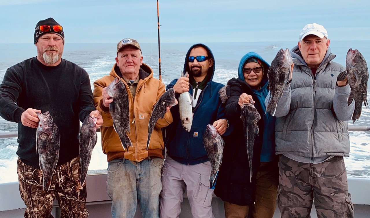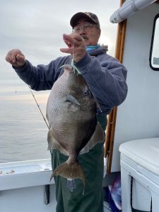Over the past couple of days Captain Kane Bounds has been enjoying the calm conditions and some terrific fishing with several boat limits of tautog and some double digit fish that have been released. Today Captain DJ Churchill was at the helm of Fish Bound and took his anglers to the deep where they mugged up on some dandy sea bass and some big triggerfish.