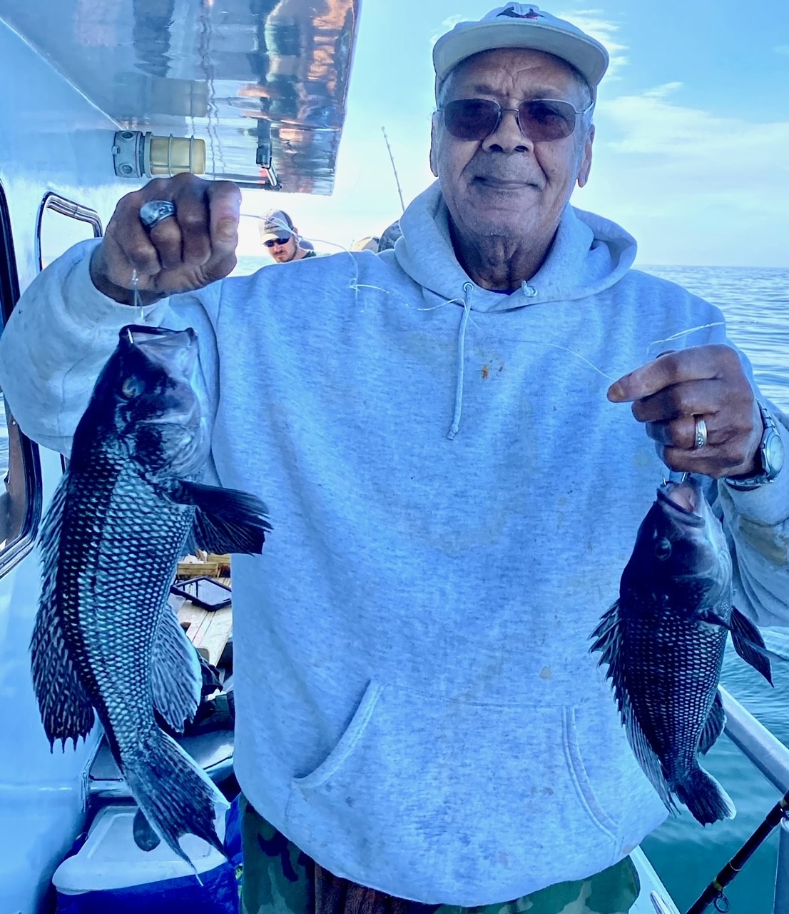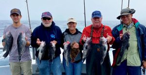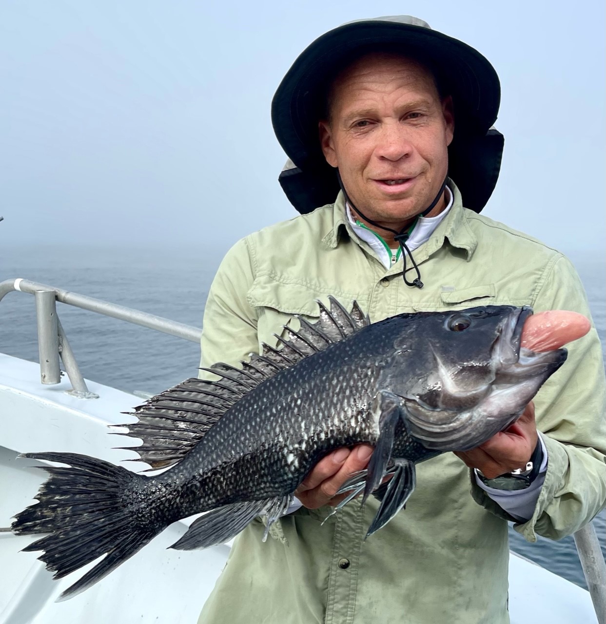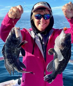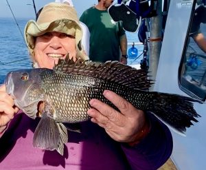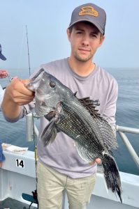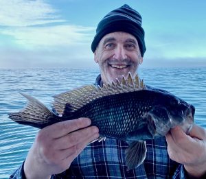 Suddenly, about a mile from today’s first spot, the curtain lifted to reveal a gorgeous day; sea bass were chewing in fine style. Cathy’s practice day with Murray (when she & he were the only clients aboard!) paid off. Cathy had the first limit in an hour and ten minutes.