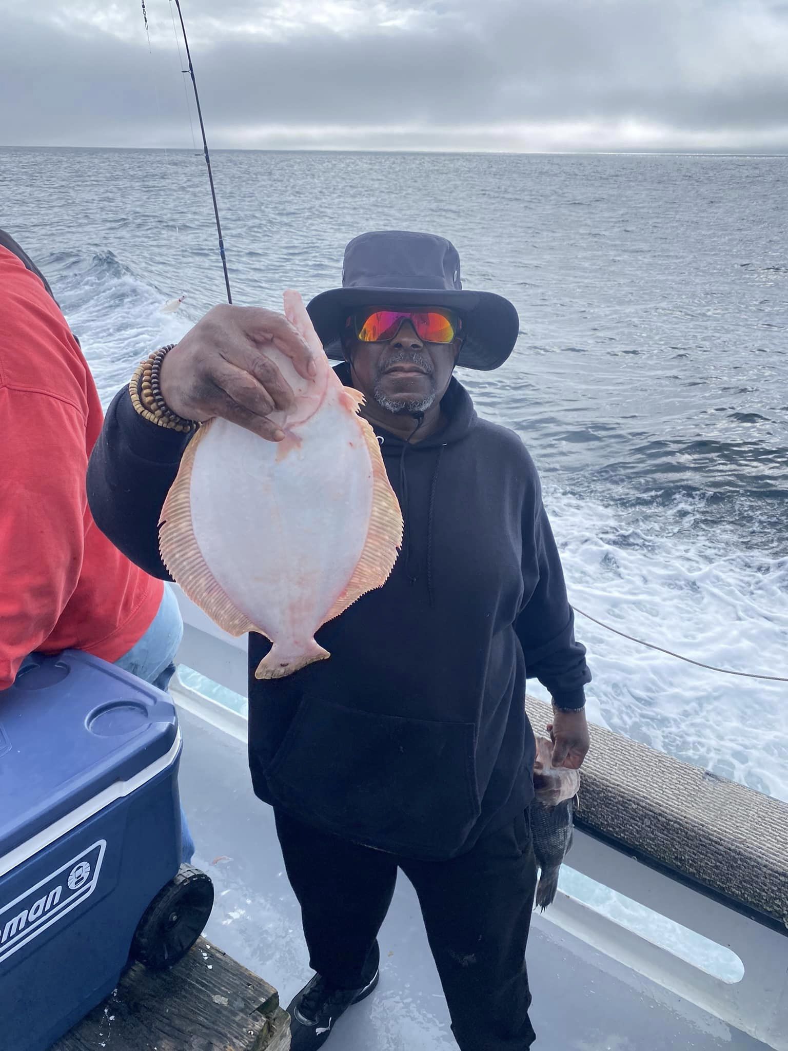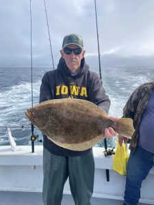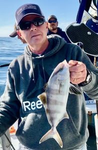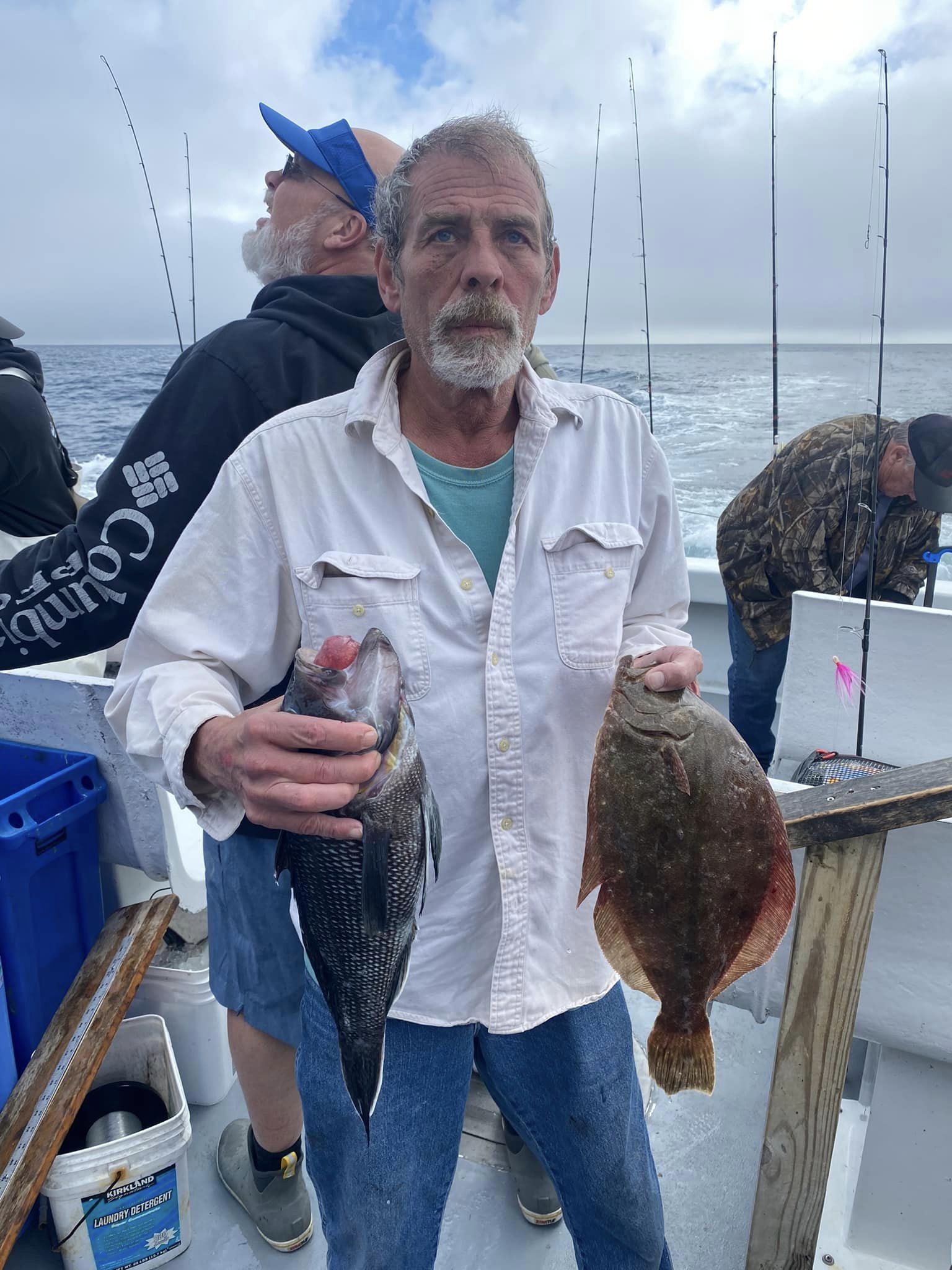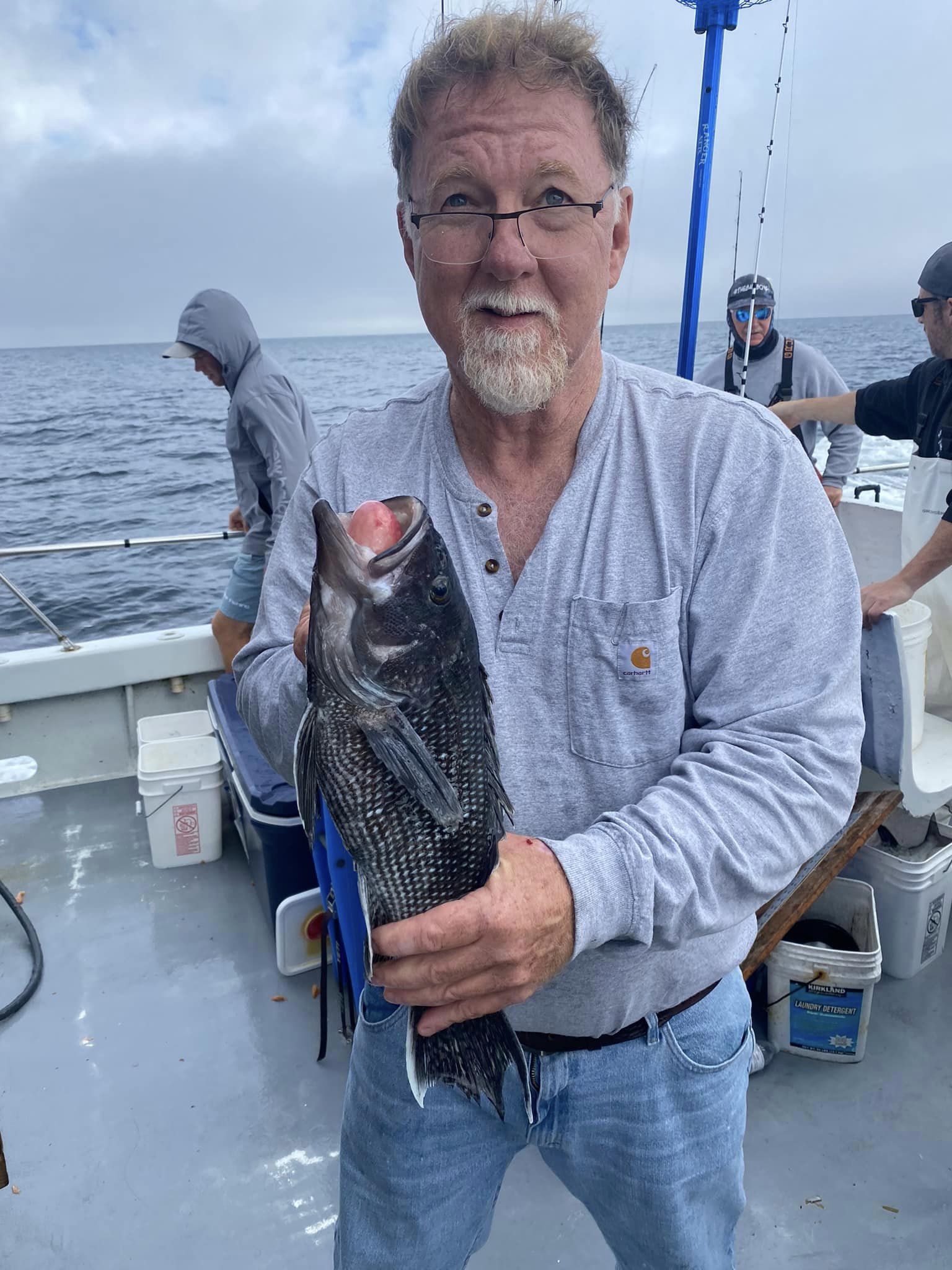 Suddenly, about a mile from today’s first spot, the curtain lifted to reveal a gorgeous day; sea bass were chewing in fine style. Cathy’s practice day with Murray (when she & he were the only clients aboard!) paid off. Cathy had the first limit in an hour and ten minutes.