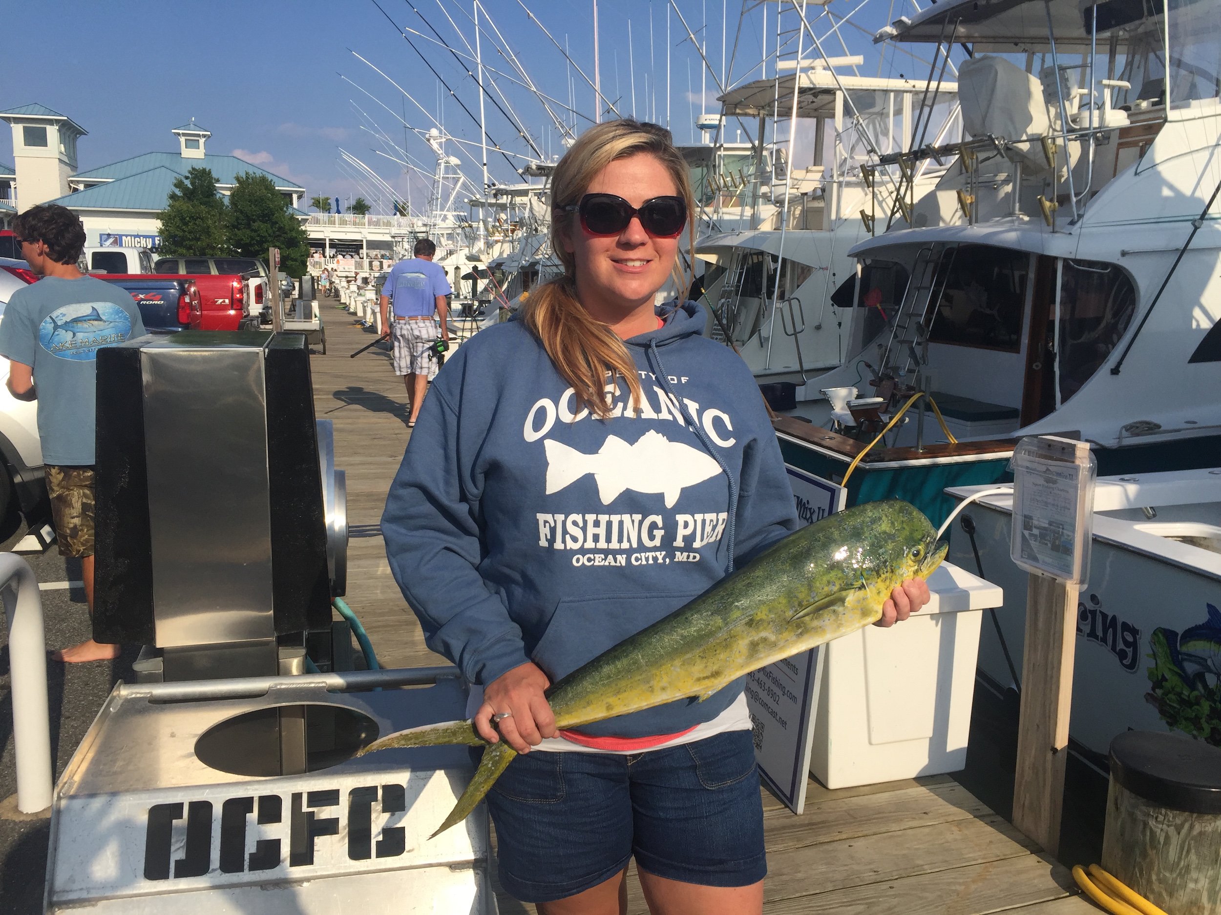 We had the offshore trip for our Fish in OC fishing trip giveaway today on the Spring Mix II out of the Ocean City Fishing Center.  We caught several undersize yellowfin tuna and a mahi while filming for an upcoming episode of Hooked on OC.  All of our anglers had a great time and it was awesome to fish with some new friends.  Here are Michael Agard, Mark Bigos, Amanda Harding and Kaitlyn Bigos with the fish that they caught today.