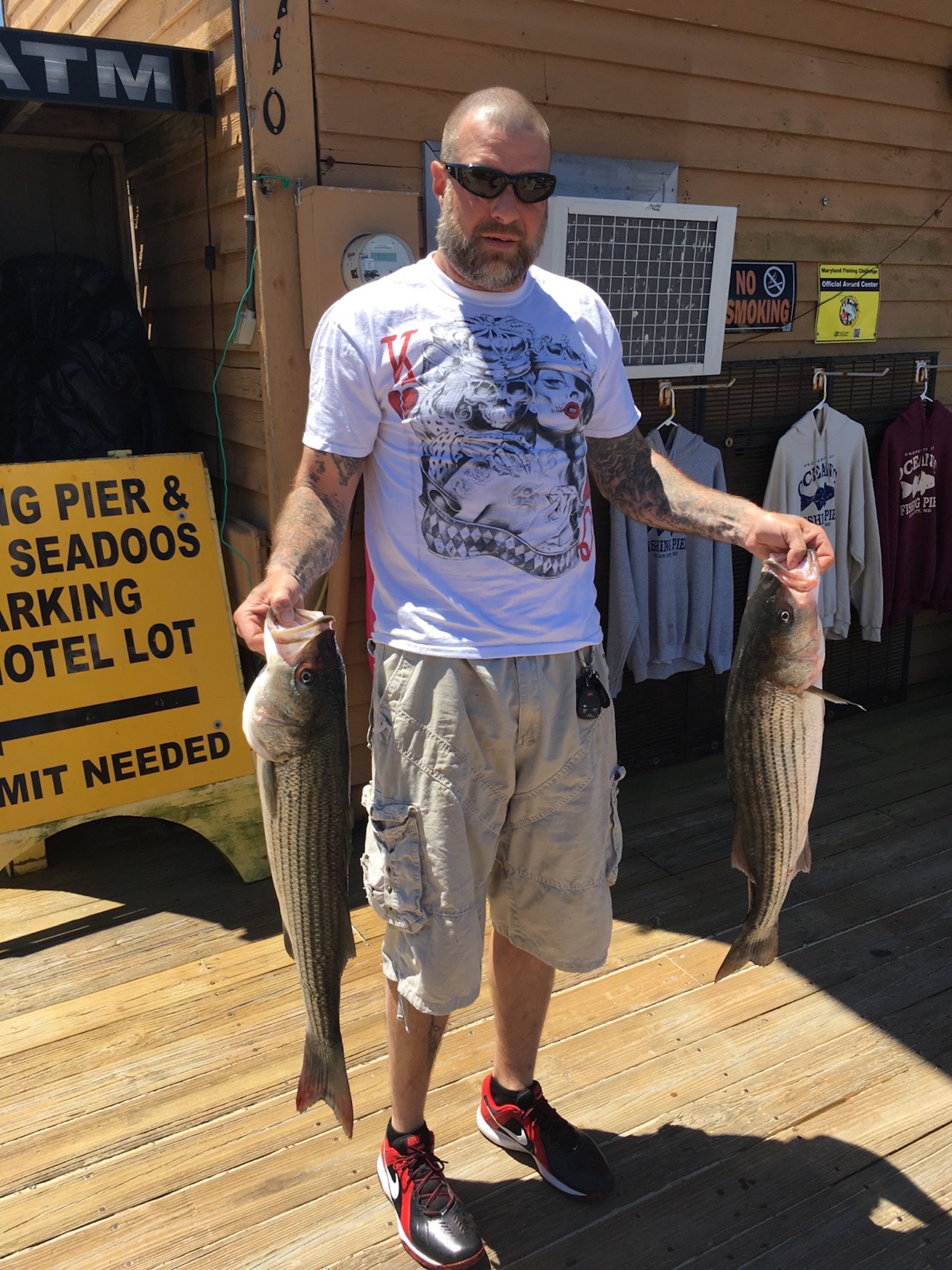 John stopped into the pier for a shot of two keeper rockfish that he caught on jig heads tipped with white Zoom baits.