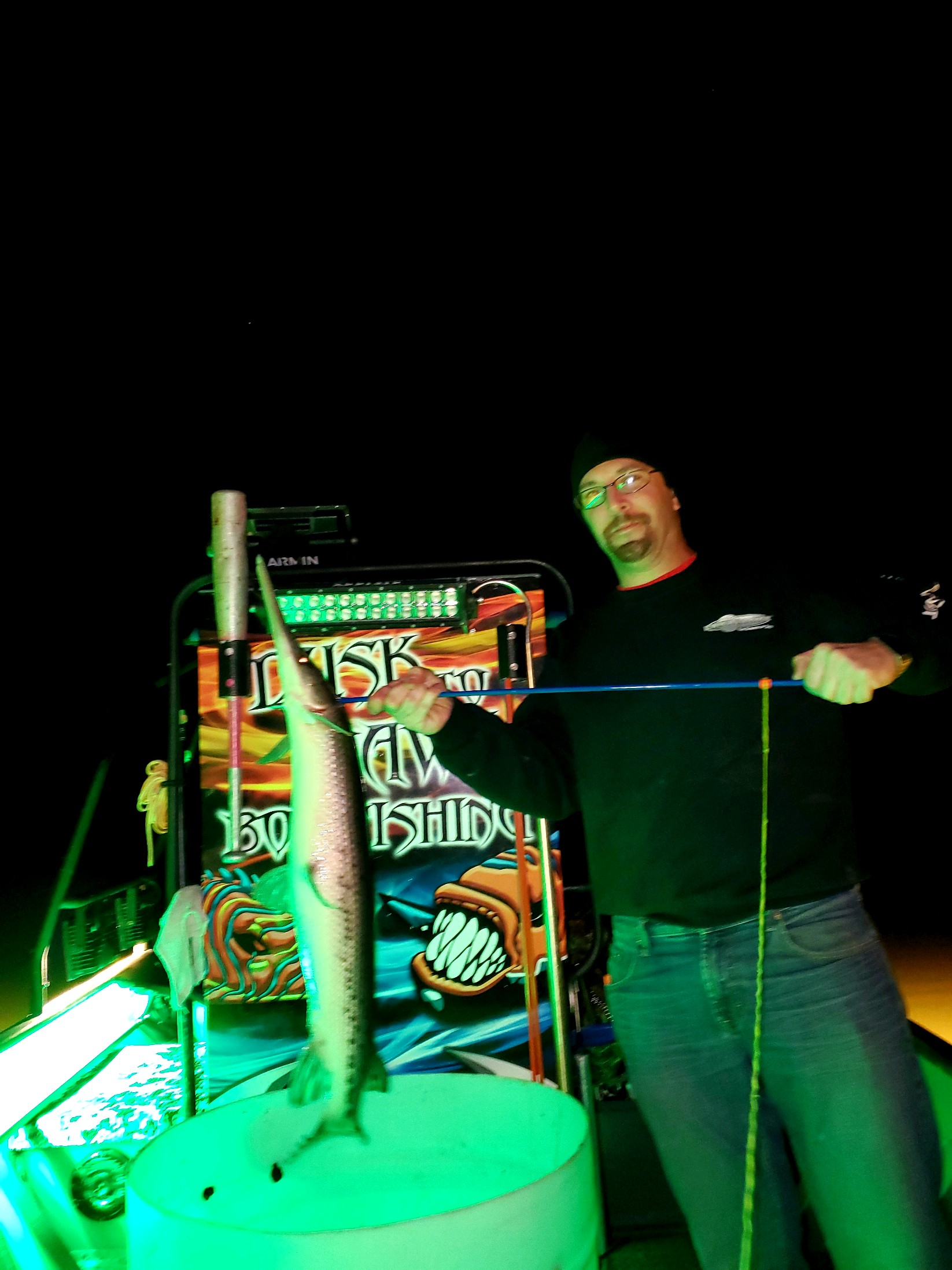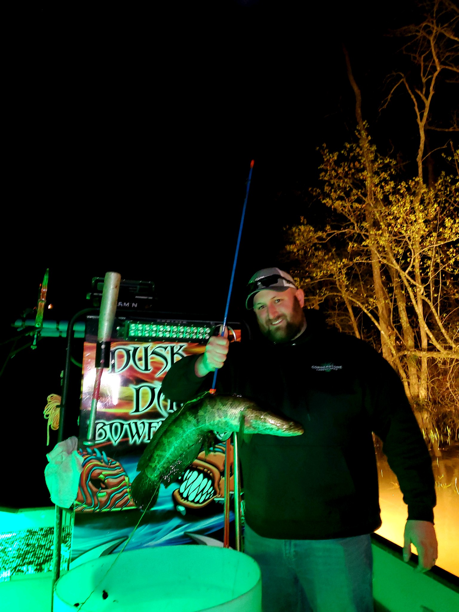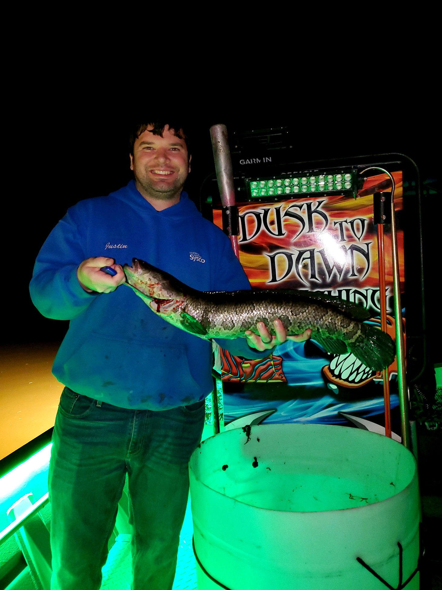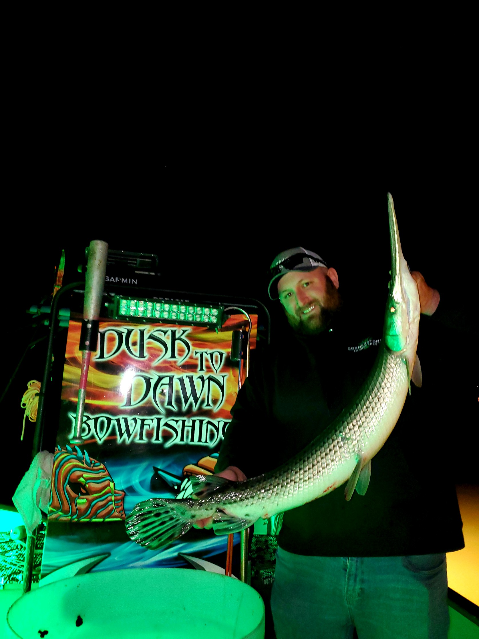 Captain Marc Spagnola of Dusk to Dawn Bowfishing had a good trip this past week that included both gar and snakehead. Captain Marc ventured out during one of our nice weather nights and put his guys on some great shooting.