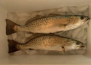 The speckled trout fishing continues to impress me with some reports of more nice fish coming in. Shaun was Roy rigging at the route 50 bridge yesterday before it got REEL windy and landed keeper fish of 18″ and 21″.