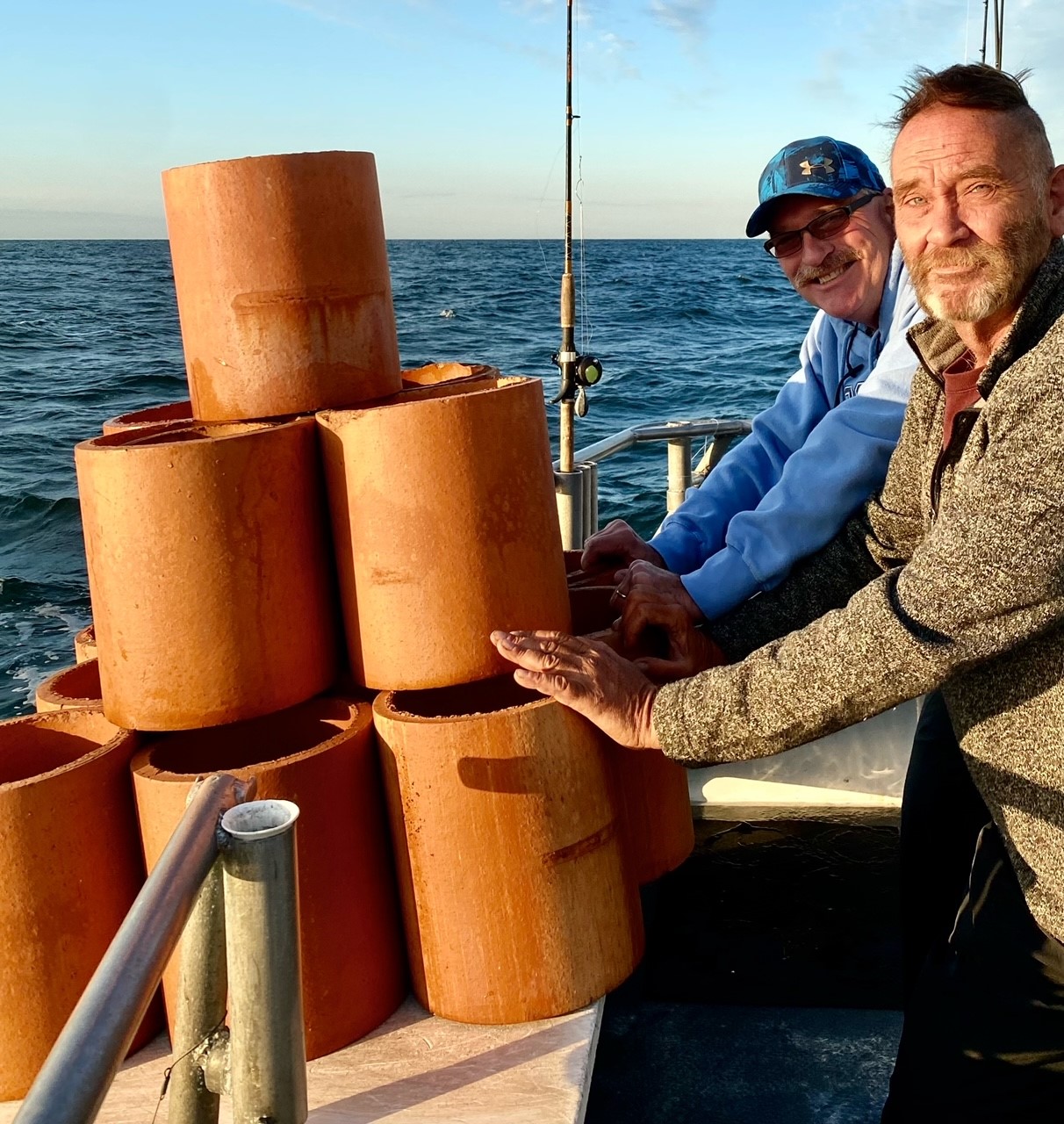 A bit later everyday now; sun broke into this fall day with just enough color to warrant a picture. Worcester County locals, Jeff & Al, did the deed on today’s reef material. We dropped a mess of short terracotta pieces and a pyramid into Tyler Long’s Memorial Reef. Coral will grow where there was none before.