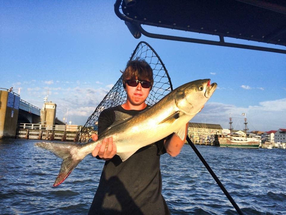 Captain John had some action this afternoon at the Rt 50 bridge that was stellar. Lots of school size stripers (under the 28″ minimum) and a good bluefish bite. Some of the bluefish were big too, upwards of eight or ten pounds!