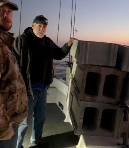 Underway early on another extended hours trip; was barely edge of dawn while locals Robert & John were dropping 20 loose blocks into the well on Uncle Murphy’s reef. Just ran the tally for an upcoming fish report; we have 40,584 Reef Blocks &, counting Capt Stormy’s 2 deployments at Bear Concrete Reef over three days – we’ve 1,827 Reef Pyramids on various sites. Today’s fishing was near about opposite yesterday’s. Where Ms Mickey, perhaps 80 years young, boxed out in under an hour and the whole rail in 2.25 – today John had the first limit at 1 o’clock and the boat just after 3. I dern sure oughtn’t complain – We DID have a boat limit..but Sakes. Mad fish on screens – none of which would touch a jig. Little guys wanting bait – bigger fellows mostly wanting to be left alone! Big difference in a day. Day was slower, but hardly wanting. Ms Madie took everyone’s pool money with a fine jumbo. Saw some strange egg casings (?!?) today.. Though plenty sporty on the way home, on the way out and when we began fishing it came mirror calm. Also saw an aircraft carrier that didn’t look US.. Ideas on either? I’m hoping to collect some raffle prizes tomorrow and Saturday. Now that the bills have come in for that loooong landing craft tow and Stormy’s recent work; we’ll need to get the Reef Raffle up and running to build more!! One day the Bass Grounds will again be one of the Mid-Atlantic’s premier reefs. Promise. CheersMonty