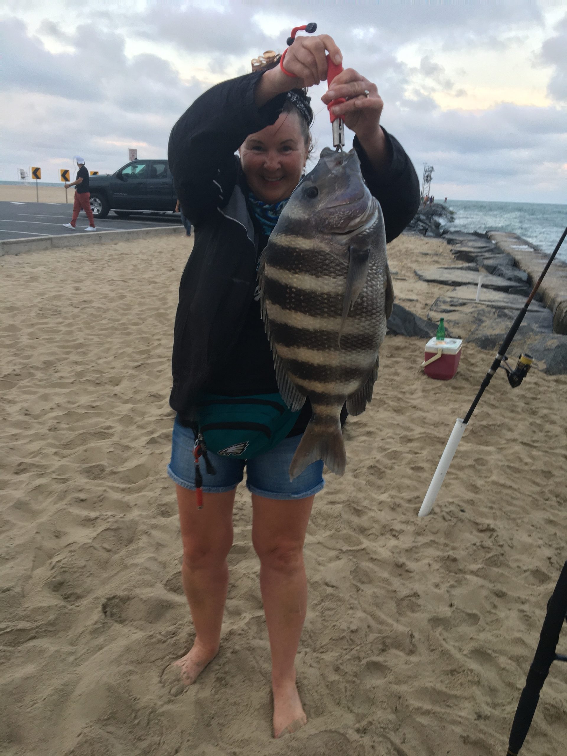 My buddy Bear of the Oceanic Pier sent this photo of Cindy in with a nice sheepshead she caught while fishing the north jetty wall.