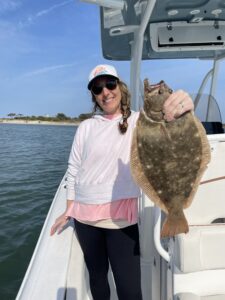 Erin Cowder was fishing with her husband Ryan behind Assateague Island when she landed her first keeper flounder of the season on the Deadly Tackle Deadly Double in chartreuse. The fat flattie was 20″.