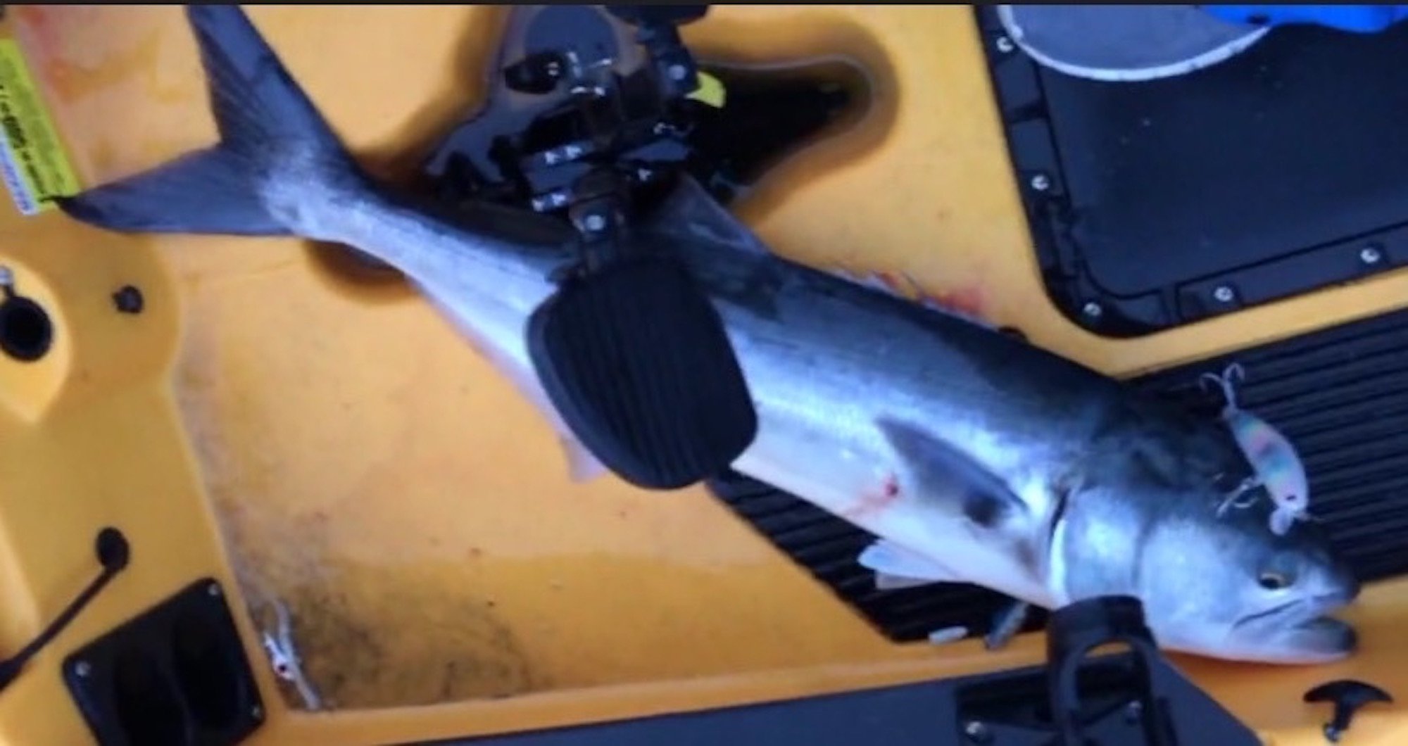 Ayrton “The Kayak Kid” Pryor of Spring Mix II is so mad at the bluefish that he went before school and caught a couple. Some 10 pounders fell to top water plugs and showed how tough it is to take a photo of a big, live bluefish in a kayak by yourself.