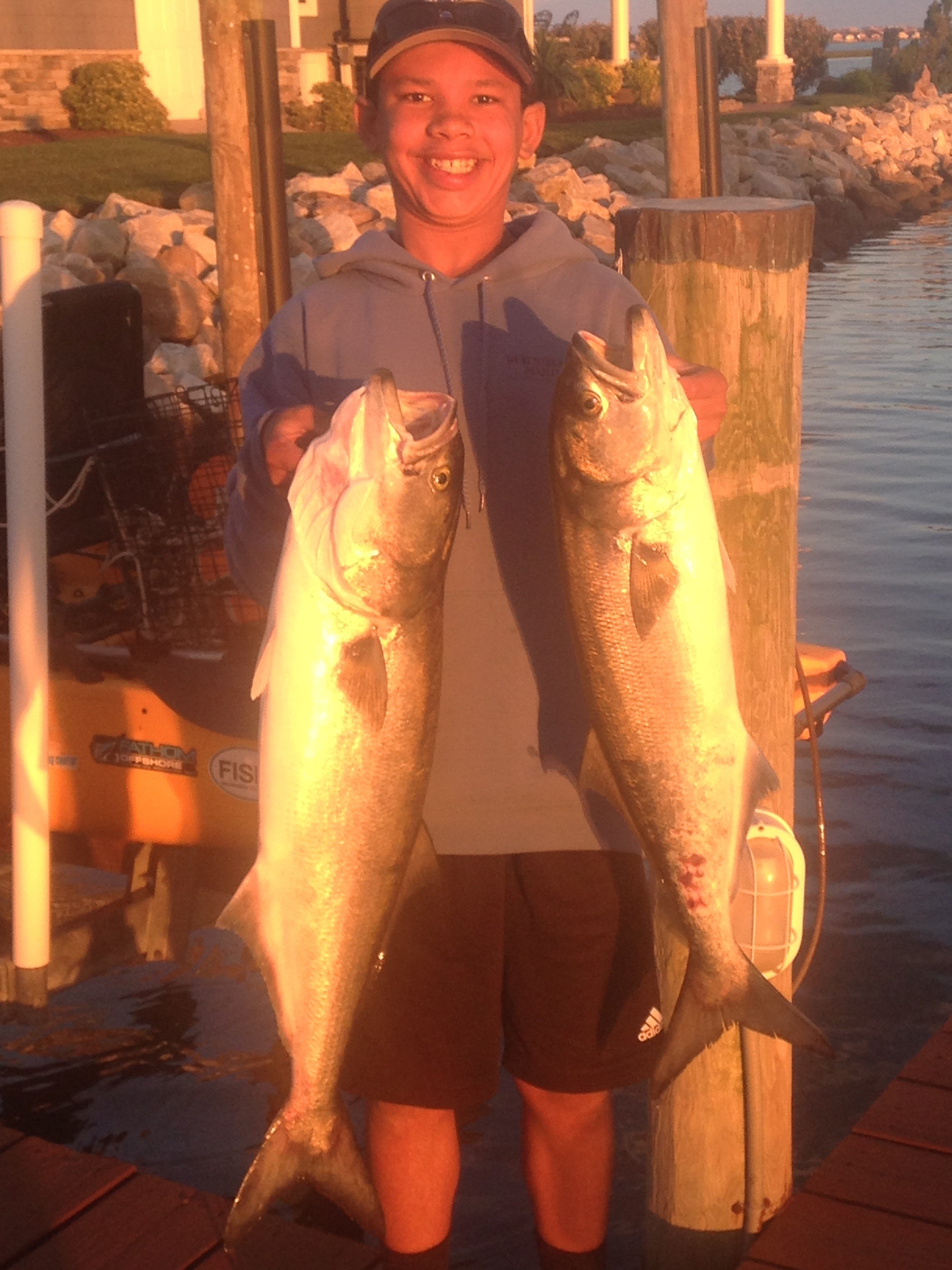 Ayrton Pryor of Spring Mix II Sportfishing had some luck yesterday afternoon on an impromptu trip in his kayak. Ayrton paddled a short distance from his home just behind Keenwik on the Bay west of Fenwick, Island and caught six really nice bluefish. Four were released and the biggest blue went 12.6 pounds. There’s a cool video of one of Ayrton’s fish on our Facebook page at Facebook.com/fishinoc
