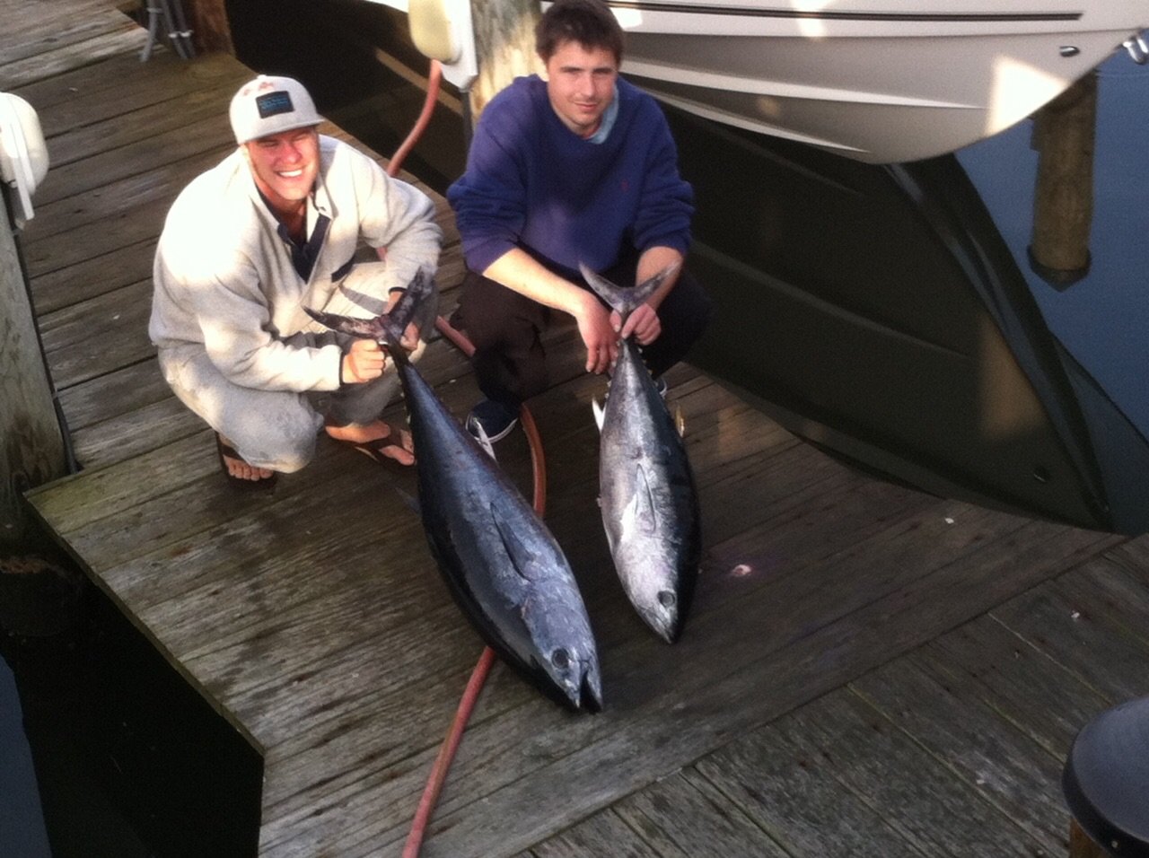 “Jeff Rosenkilde and I headed offshore yesterday morning at 3 AM. We had a little bit of a bumpy ride on the way out and ended up running 83 miles outside the Wilmington where we found 64 degree water. We trolled around it for hours without anything. We even had a pod of five or six killer whales swimming around the boat…..one of them was (expletive deleted) huge! We never got any bites so we started trolling south. Once we got outside the Baltimore we started seeing life inside towards the shelf and when we got into 800 fathoms we started marking bait thick from the surface all the way down to 50 fathoms and tuna were streaking through it. It was cold, nasty looking water that was only 60 degrees. We ended up going two for three on tuna with a 50 pound bluefin and a 30 pound yellowfin. We also had two mako bites on the troll that both eventually broke off. I’d estimate one of them at 300 to 400 pounds. We also caught a blue shark on the troll on the way back which I’ve never done before. The tuna were caught on a green machine spreader bar and the mako bites were on skirted ballyhoo.”