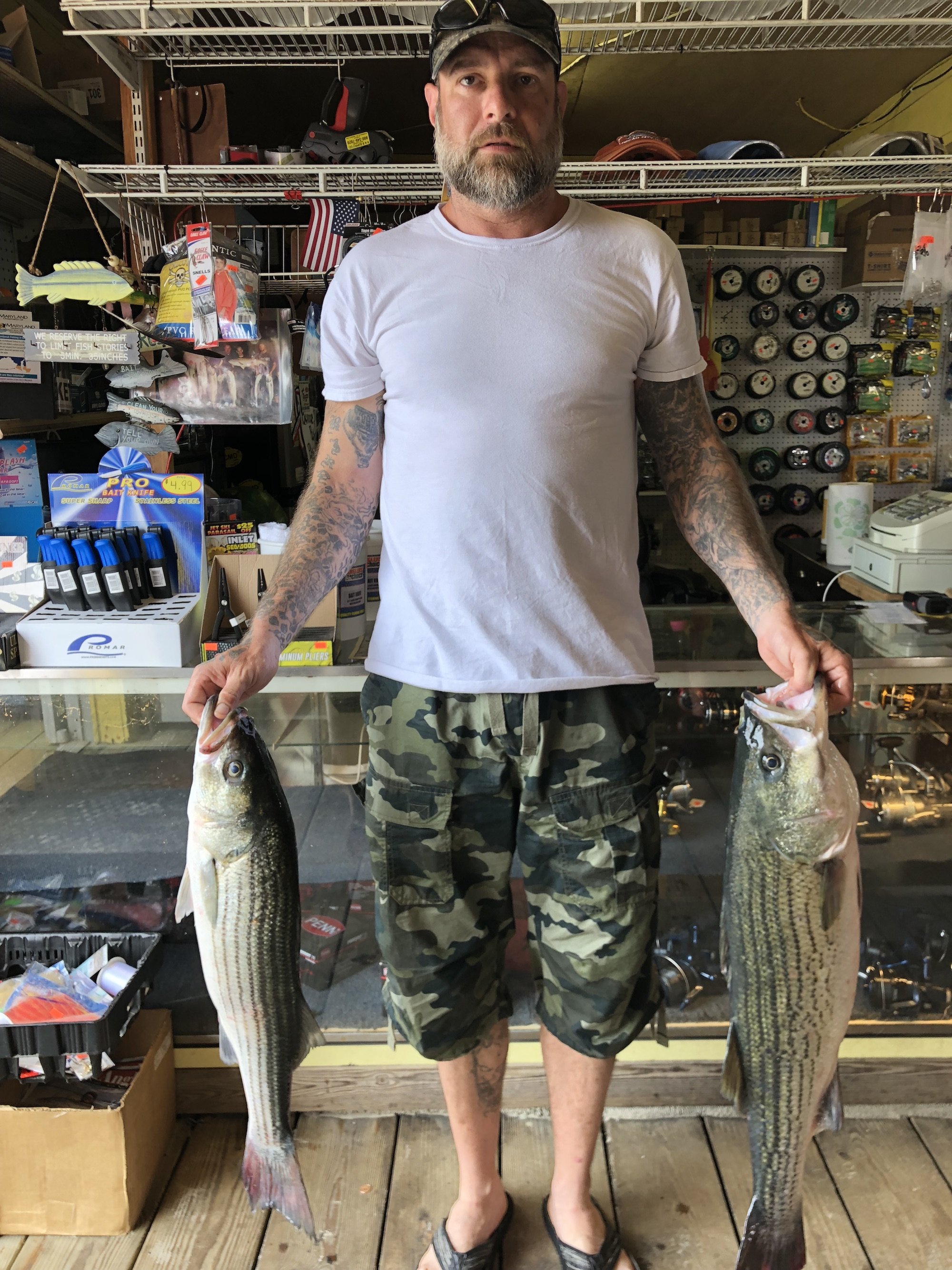 Bear at the Oceanic Pier in downtown Ocean City sent me these shots of John and Amber who have been smoking the fish downtown.  They have been having great luck with bluefish and rockfish (some keepers) while casting Zoom and Z Mann artificials.