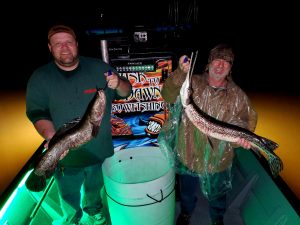 Captain Marc Spagnola of Dusk to Dawn Bowfishing had a nice trip in the pouring down rain the other night with clients that didn’t mind one bit. Captain Marc put his shooters on good action for snakeheads and gar.