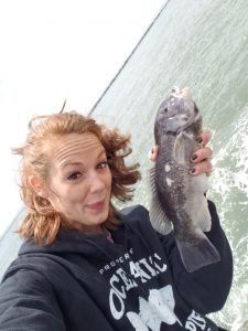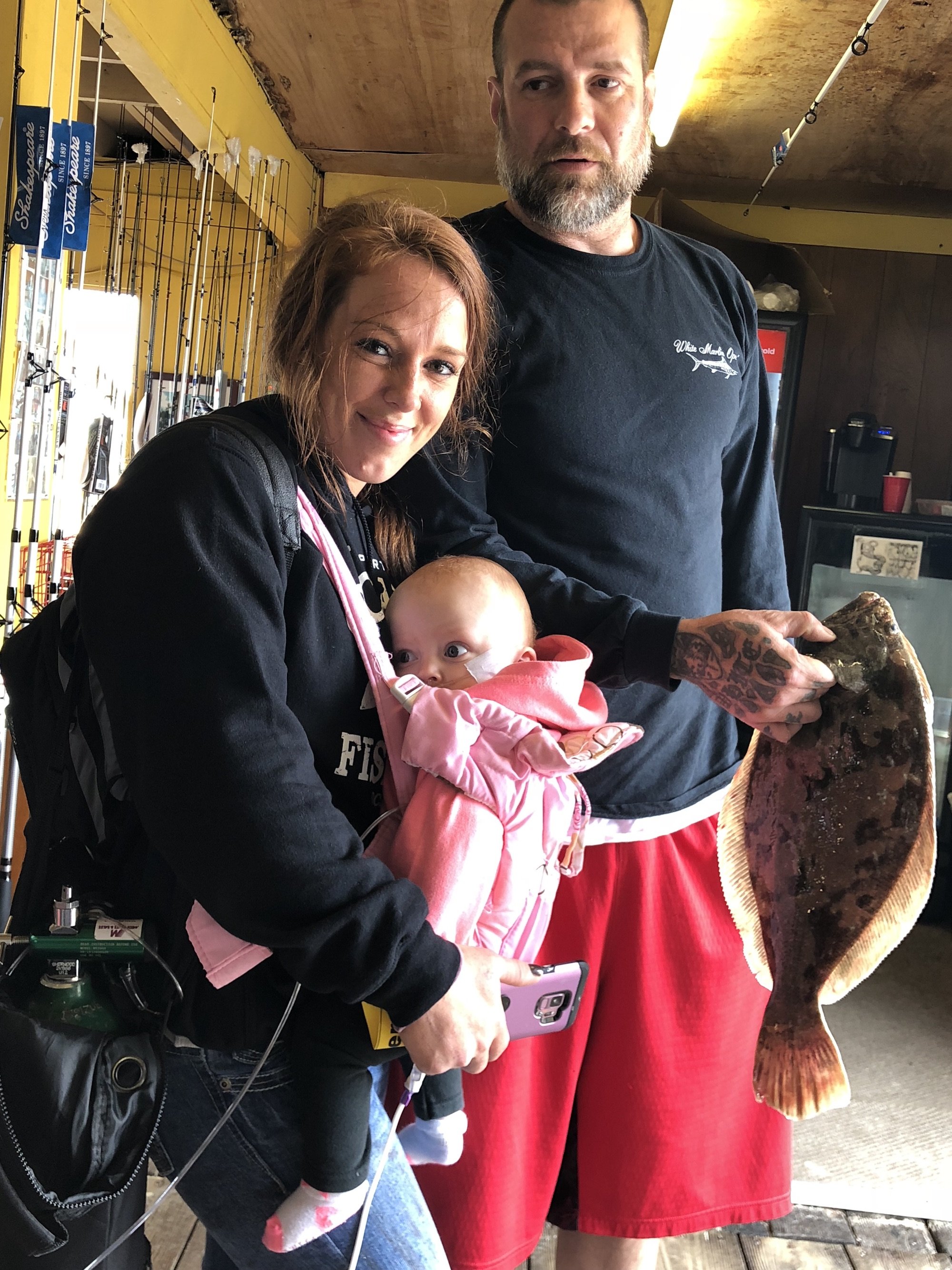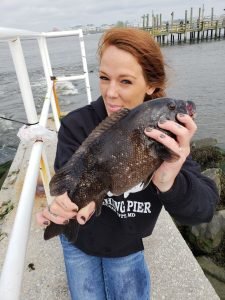 Bear down at the Oceanic Pier says that Amber Smoker, John, “Sandflea” and their crew are down for the weekend and having some pretty good luck fishing the Oceanic Pier and the north sea wall on the inlet. Amber, John and “Sandflea” landed a nice flounder that went in the cooler and Amber and some of the other guys have caught and released tautog up to 19″ and boxed some bluefish along the way as well.