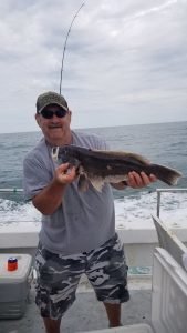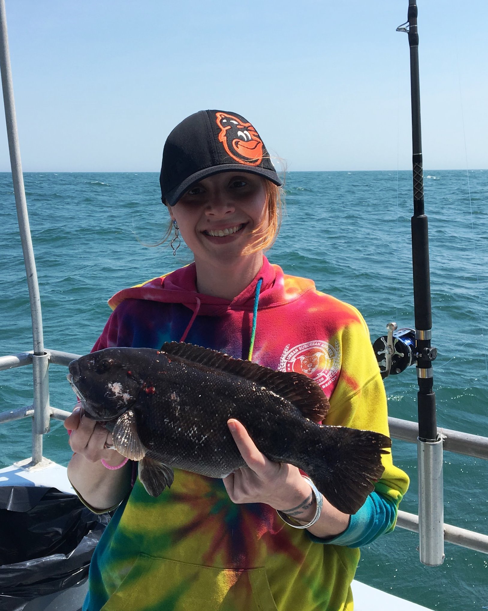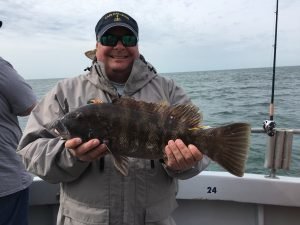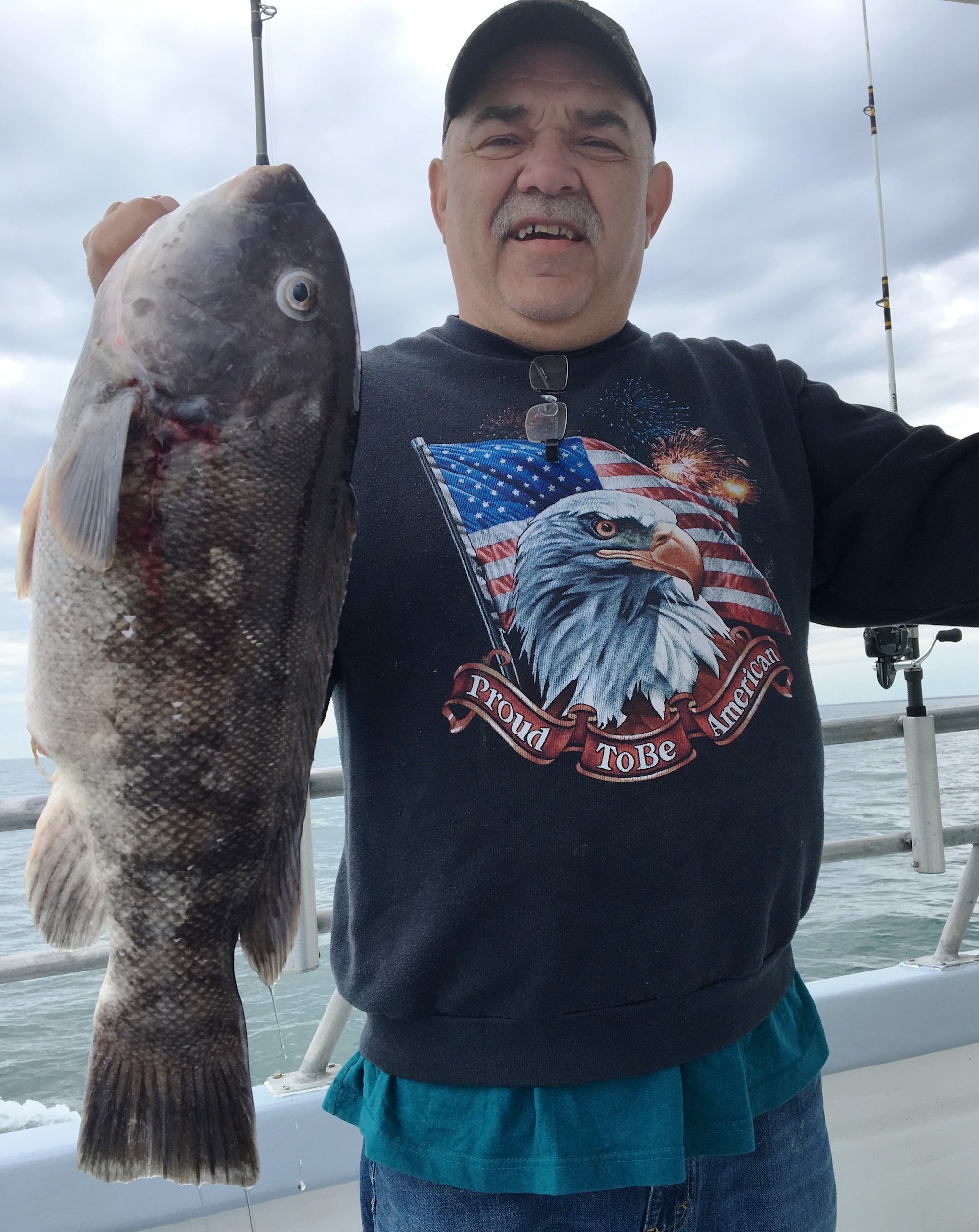 Captain Monty Hawkins on the Morning Star reported catching tog on today’s trip. There were some throwbacks, a few fish that were tagged and some that went home for dinner. George Bell is pictured below with a nice 21.5″ female that he released.